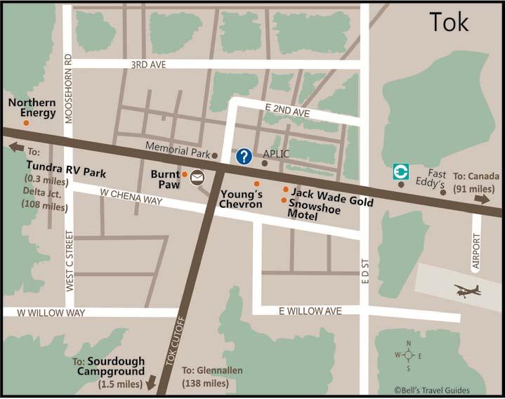 Sourdough Campground also has an open-air museum with gold rush memorabilia. Only 1¾ miles from Tok Visitor Center on the Tok Cut-off (Hwy 1). 907-883-5543 Tundra RV Park and Bar has full and partial hookup RV sites, tent sites and is home to a popular local bar. The forested park like setting gives guests a relaxing and peaceful camping experience. 50/30/20 amp sites, pull-throughs, clean restrooms, Laundromat, Wi-fi hotspot and RV dump station. Located at 1315 Alaska Highway. Summer: 907-883-7875, year-round: 907-301-7060