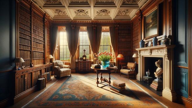 19th-century English coffered ceiling, dark oak brick-red carpet. Surrounding bookcases, antique maps, and atmosphere of scholarly with an intensified apricot windows, casting warm, room. Within this setting, elegant chair beside a statuette.Acrossfromhim, attention. The scene should atmosphere,invitingviewers ambiance of the library.