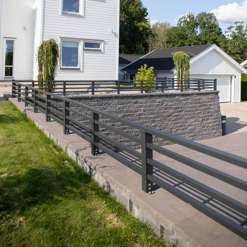 Funkis är ett staket i modern utformning och är gjort av galvaniserat pulverlackerat stål och finns både som tvåmeters startpaket och enmeters tillbyggnadssektion.