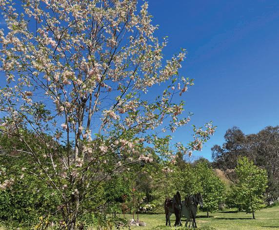 The garden has a small vegetable patch as well as a small orchard and features two dams, a ruin, a bridge over the ephemeral creek, a sculpture garden and a wildflower walk. Unusual features include a rustic clock tower and a pirates’ tavern where you can sit and relax.