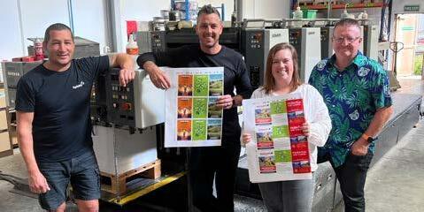 Members of the Benefitz team involved in producing golf scorecards. Leighton Hill (print production supervisor), Blake Douglas (sales manager), Leanika Starbuck (design) and Aidan Bennett (Warriors supporter and MD).