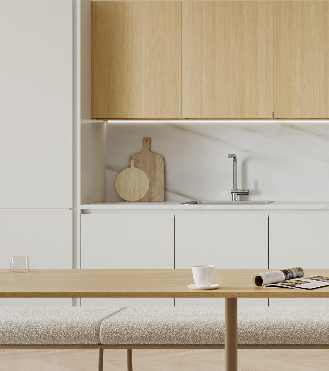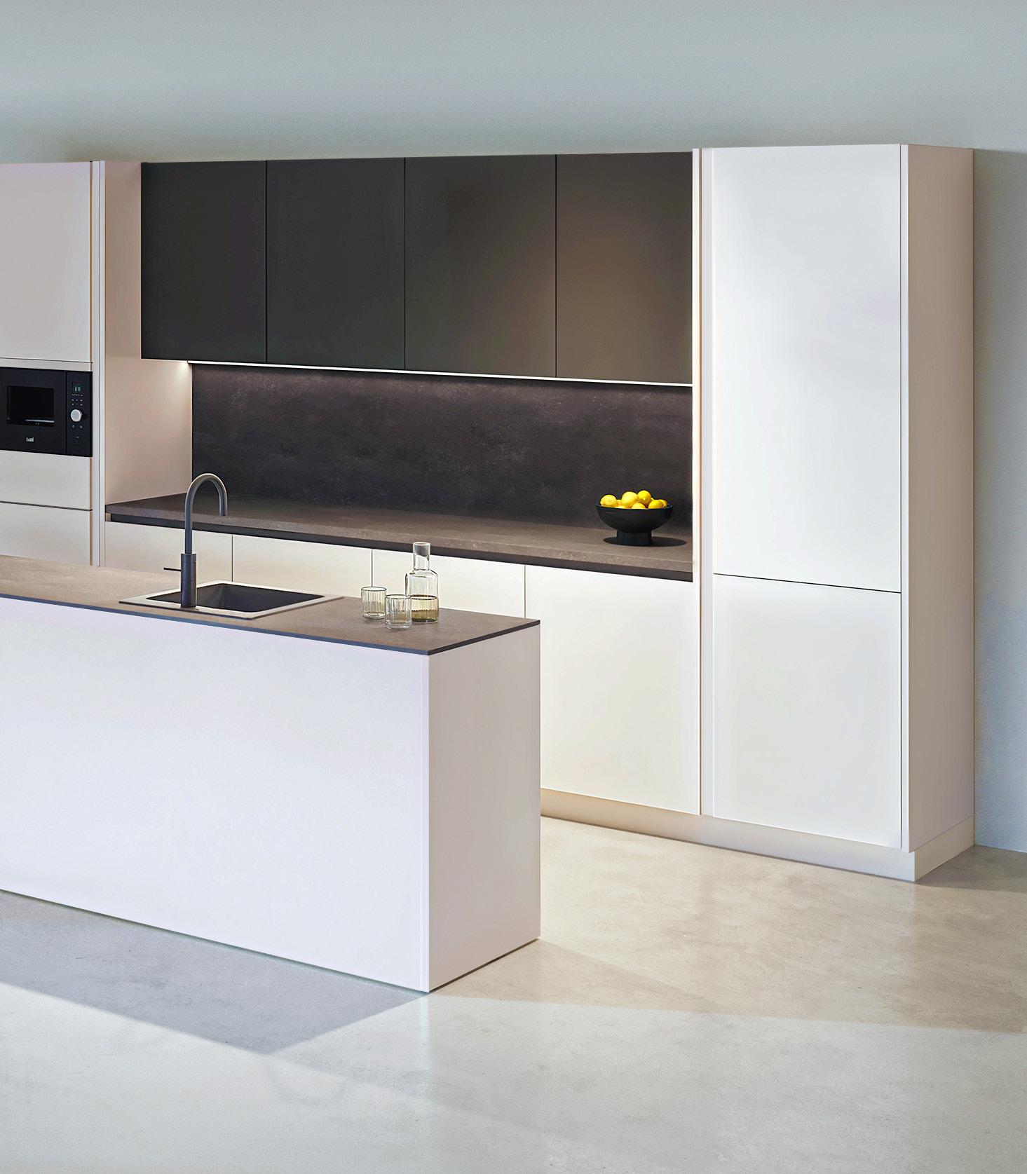 Das Küchenmodell SMART mit modernen, versteckten Griffleisten sorgt für ein minimalistisch, elegantes Design. Die Griffleisten sind in unterschiedlichen Farben konfigurierbar und können waagrecht oder senkrecht an der Küchenfront angebracht werden