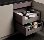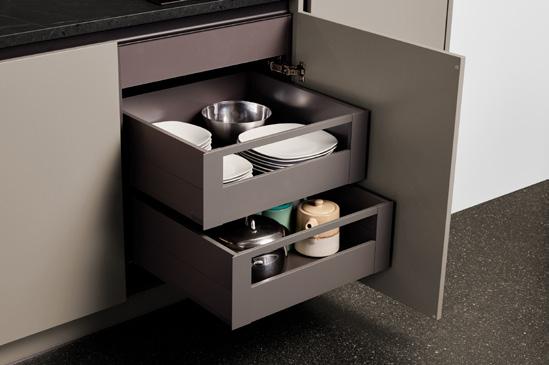 Die Schubladen sind in den Höhen 91 mm und 192 mm erhältlich. Sie verfügen über einen Vollauszug, sind gedämpft und bieten eine Belastbarkeit von bis zu 40 kg. Auf Wunsch können innenliegende Schubladen integriert werden.