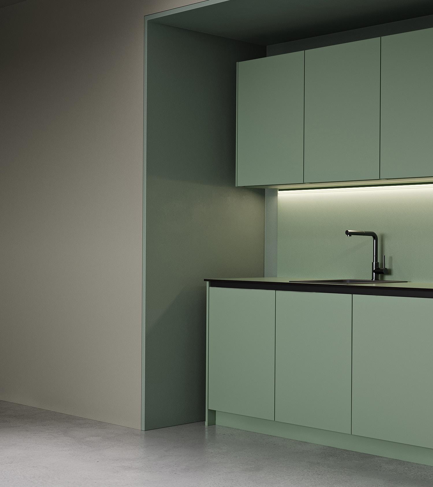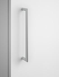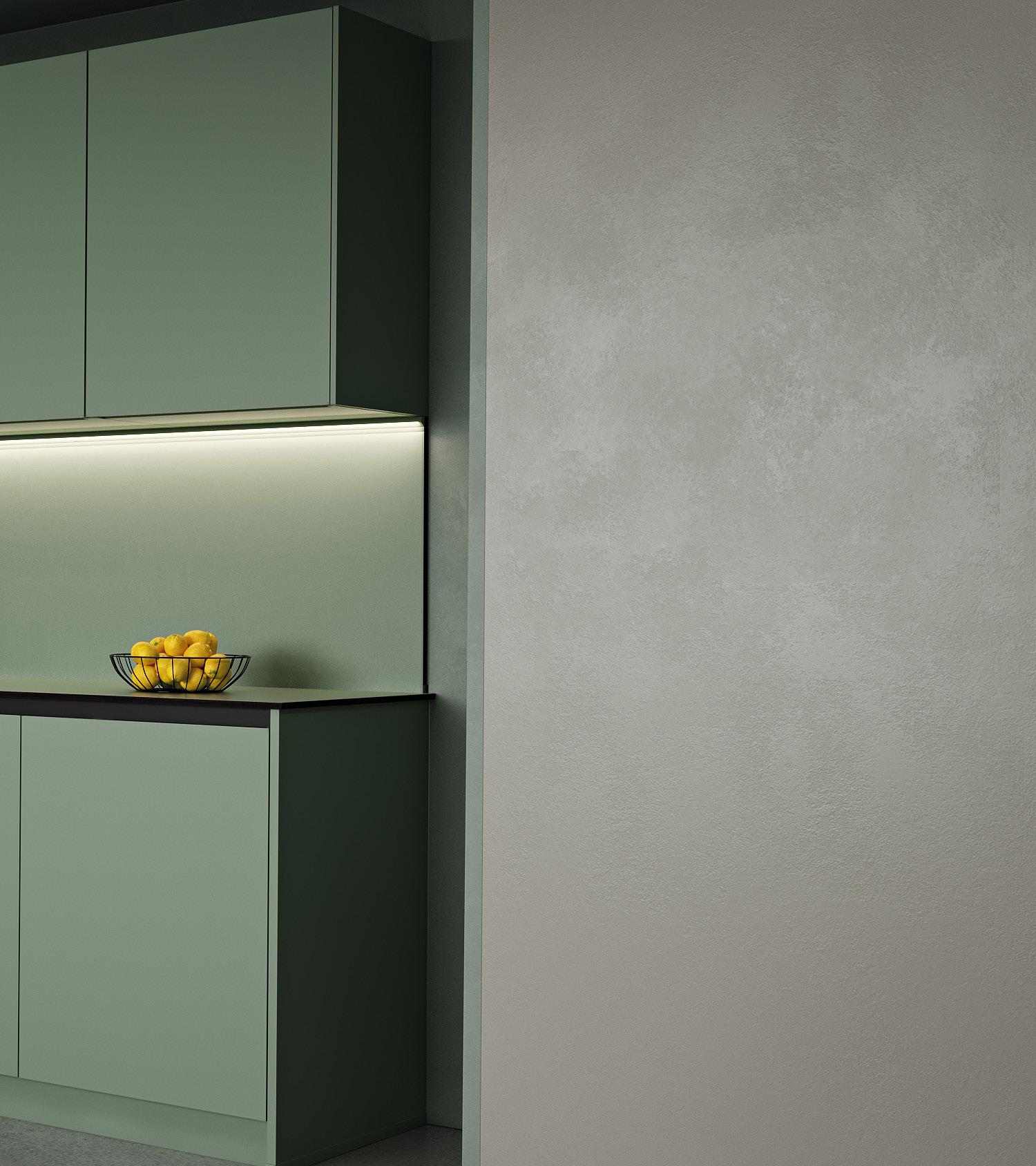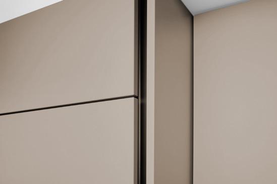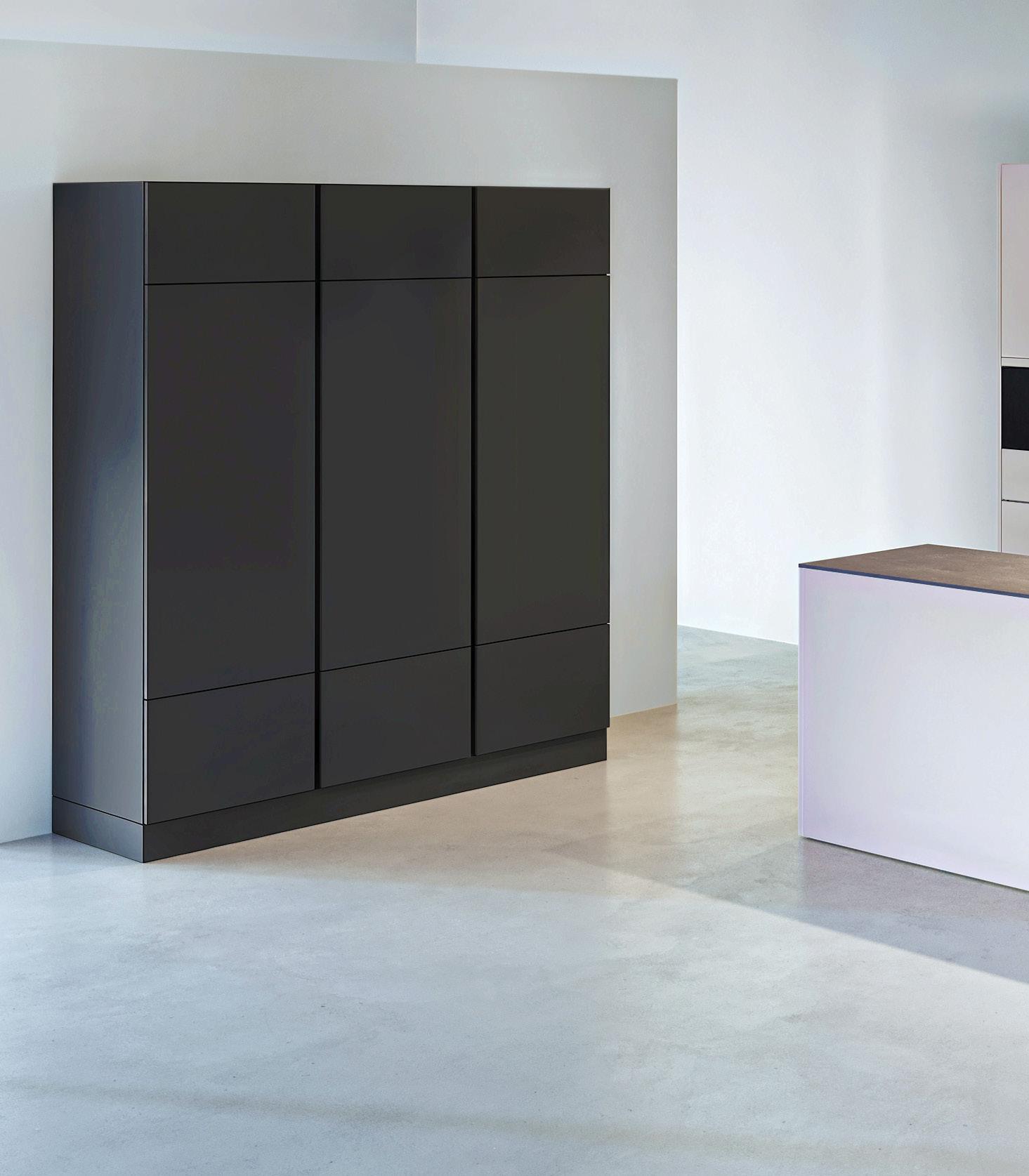 Die versteckten Griffleisten sind je nach Korpustyp unterschiedlich ausgerichtet: Bei Unter- und Oberschränken verlaufen sie horizontal, bei Hochschränken vertikal. Material: Aluminium