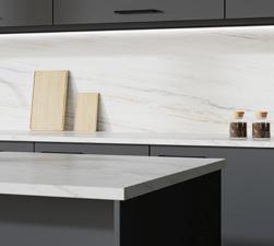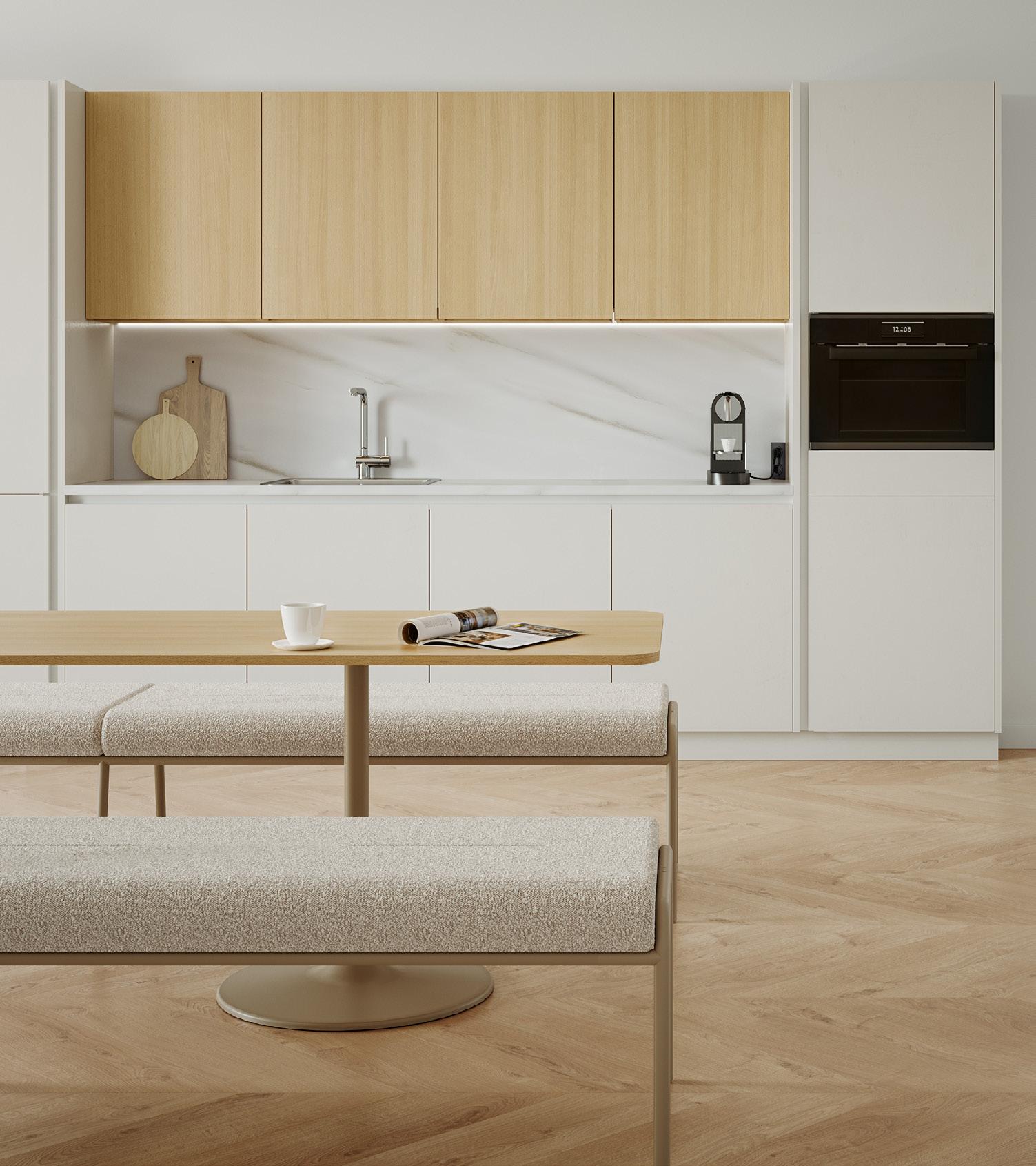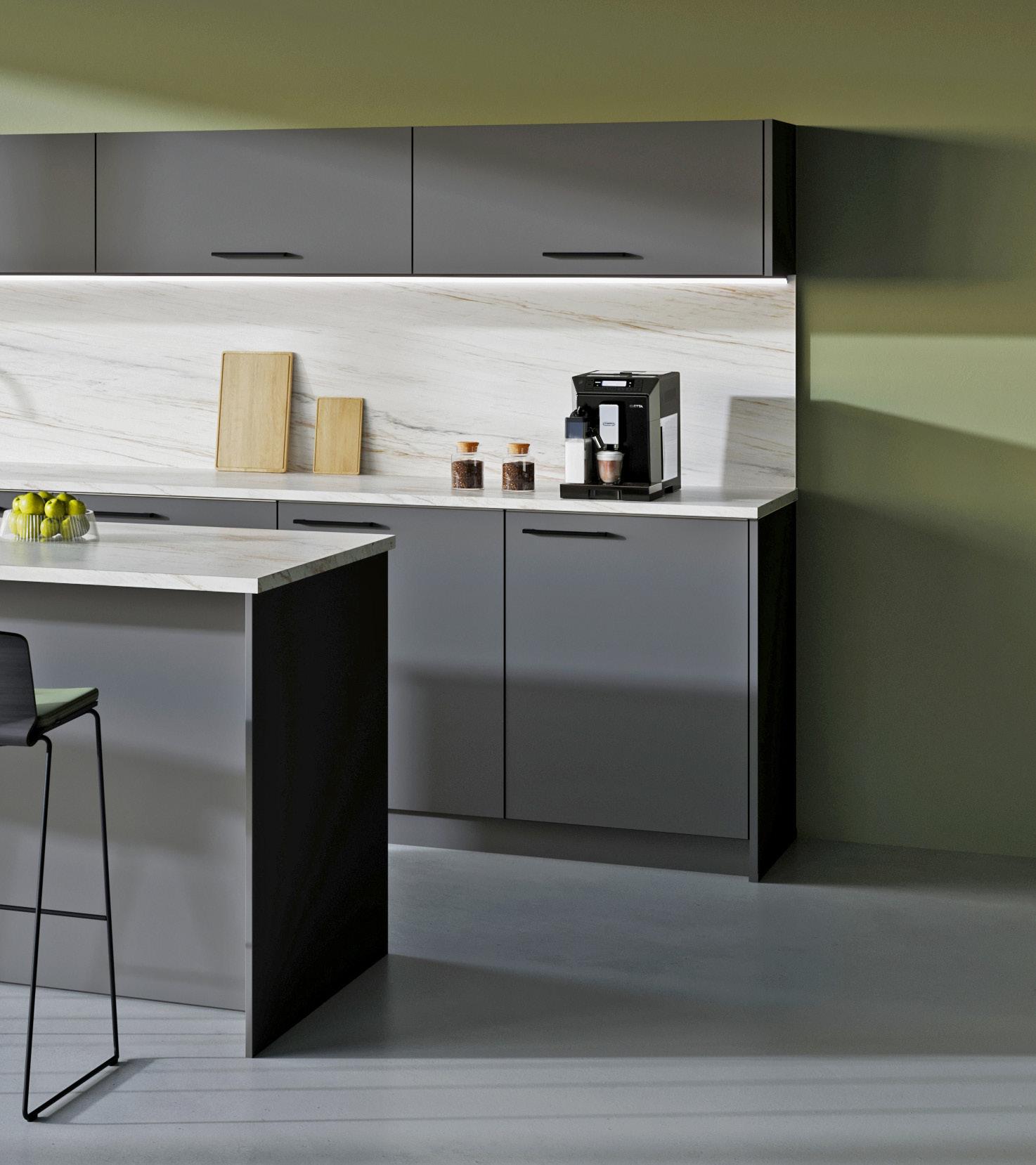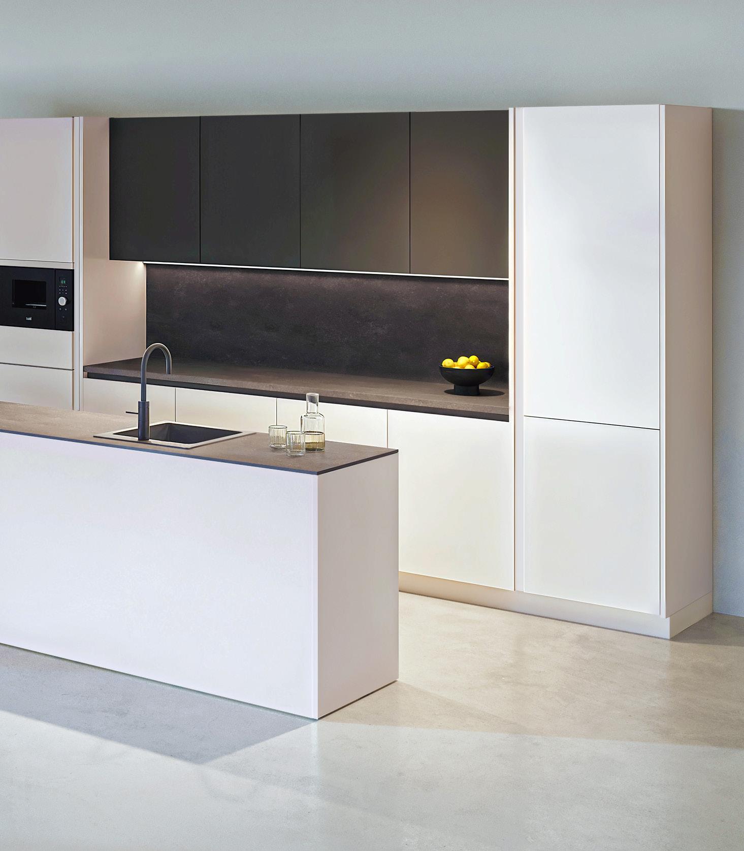 The SMART kitchen model with modern, concealed handle strips creates a minimalist, elegant design. The handle strips can be configured in different colours and can be fitted horizontally or vertically on the kitchen front.