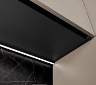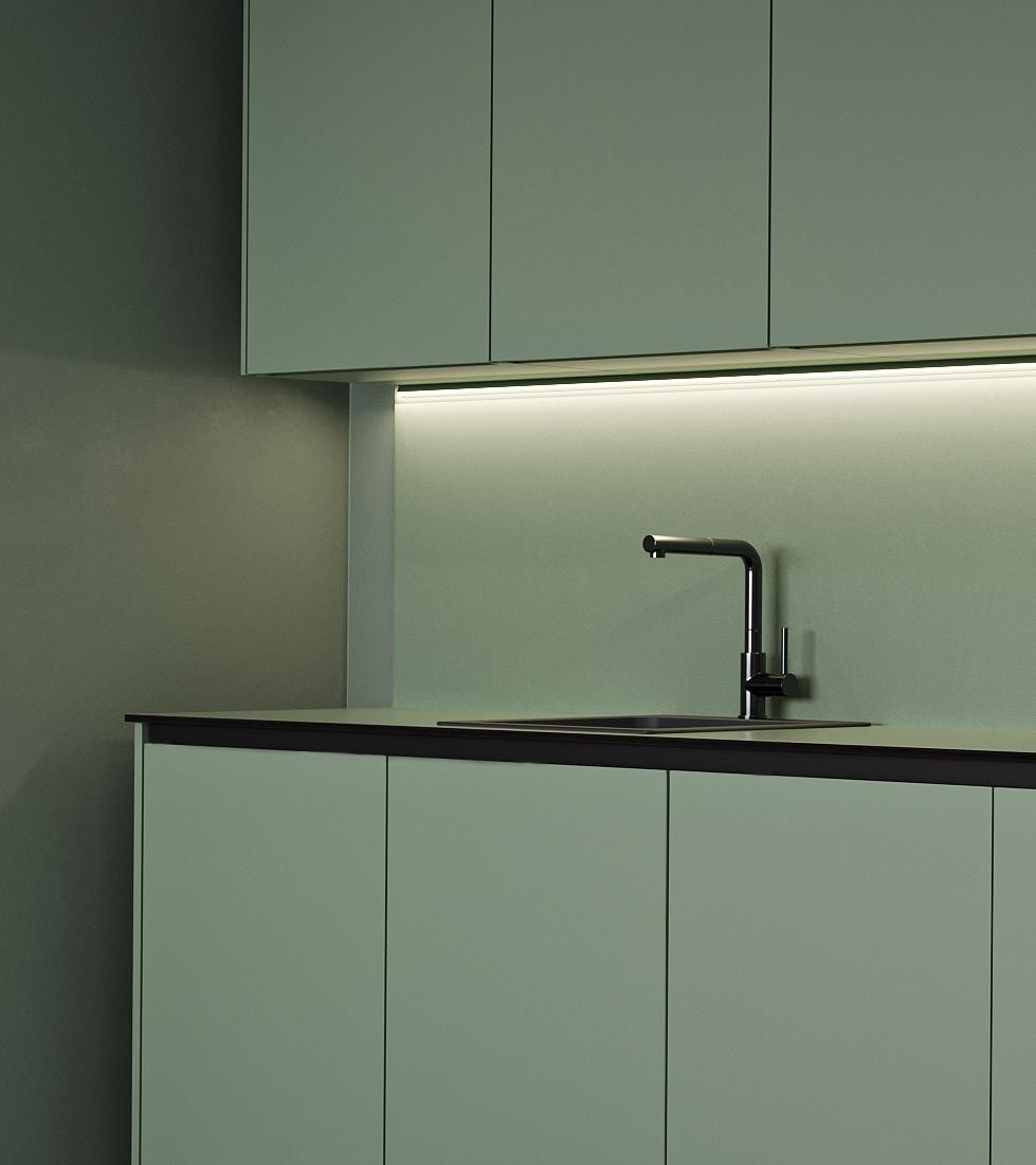 Lighting can be integrated into the worktop. Optionally with a 3 / 5 spotlight set or with a 600 / 900 / 1.200 mm LED strip, each in the colours black or silver.