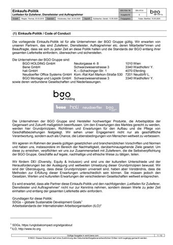 Die vorliegende Einkaufs-Politik ist für alle Unternehmen der BGO Gruppe gültig. Wir erwarten von unseren Partnern, das sind Zulieferer, Dienstleister, Auftragnehmer etc. deren Mitarbeiter*innen und Beauftragte, dass sie sich zu jeder Zeit an diese Politik halten und die Standards der BGO entlang ihrer gesamten Lieferkette einfordern, überwachen und sicherstellen.