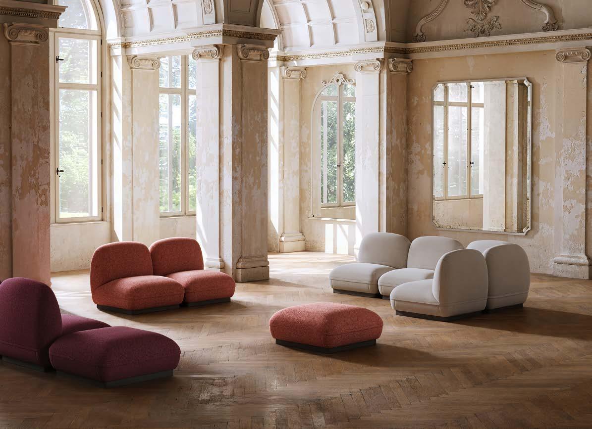 pièces peuvent être facilement recyclées. Avec trois modules différents – élément d’angle, module simple et pouf – il est possible de créer de nombreuses configurations. Celles-ci peuvent être adaptées ou étendues à tout moment grâce à la modularité, offrant ainsi une flexibilité maximale, parfaitement adaptée à l’espace et à l’usage. COOMO Outdoor est la version résistante aux intempéries, conçue pour une utilisation en extérieur.
