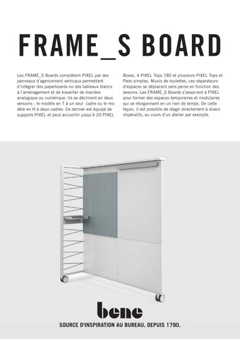 Boxes, 4 PIXEL Tops 180 et plusieurs PIXEL Tops et Pads simples. Munis de roulettes, ces séparateurs d’espaces se déplacent sans peine en fonction des besoins. Les FRAME_S Boards s’associent à PIXEL pour former des espaces temporaires et modulaires qui se réorganisent en un rien de temps. De cette façon, il est possible de réagir directement à divers impératifs, au cours d’un atelier par exemple.
