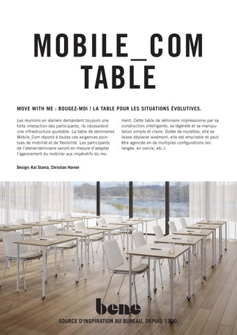 Les réunions en ateliers demandent toujours une forte interaction des participants, ils nécessitent une infrastructure ajustable. La table de séminaires Mobile_Com répond à toutes ces exigences pointues de mobilité et de flexibilité. Les participants de l’atelier/séminaire seront en mesure d’adapter l’agencement du mobilier aux impératifs du mo-