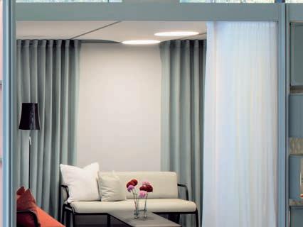 Infill sont disponibles dans différentes matières, textures et couleurs. Grâce à l’association des éléments d’aménagement variés avec diverses options d’éclairage, des accessoires et des objets complémentaires, il est possible de créer l’ambiance souhaitée. Plusieurs modèles de rideaux garantissent une ambiance chaleureuse et confortable, particulièrement dans les zones de communication et les espaces lounge. Des étagères en version mélamine ou ébénisterie complètent le portefeuille en offrant un espace de rangement.