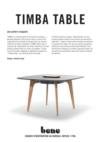 TIMBA, la nouvelle gamme de mobilier de Bene, a été spécialement conçue pour créer un point d’ancrage destiné au travail en équipe dans les environnements de travail modernes. TIMBA Table crée la surprise par l’association du chêne massif et d’un top access pivotant situé au milieu du plateau. Il dissimule de manière élégante le logement encastré du « Power Bowl » qui permet de se raccorder