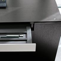 Hochwertige Materialien und qualitätsvolle Verarbeitung zeigen sich in allen Details: Schreibunterlagen aus Leder sind eben in die Tischfläche eingesetzt, UtensilienLaden mit Leder ausgekleidet. Alle Laden mit Selbsteinzug, alle Laden außer Utensilienlade optional mit Servo-drive ausstattbar. High quality materials and workmanship are demonstrated in every design aspect: Leather writing pads are integrated into the tabletop, drawers are lined with leather. All drawers are selfclosing, all drawers except utensil drawer are fitted with an optional servo-mechanism.