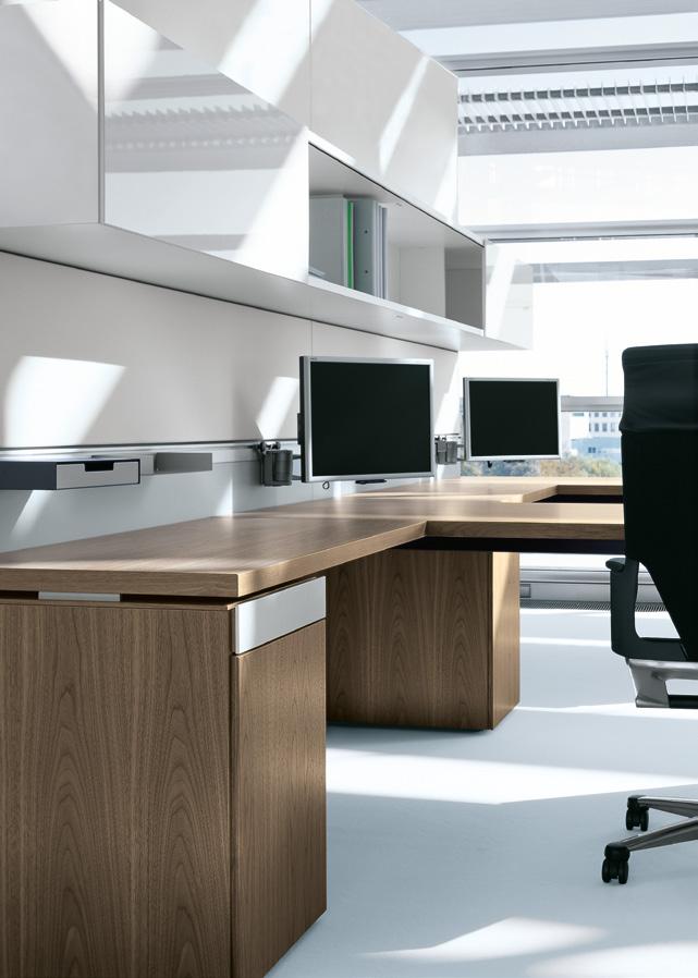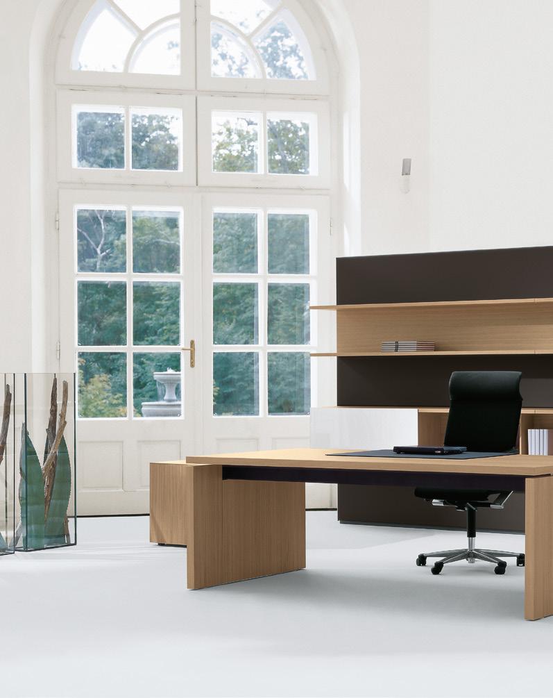 Freie Tischflächen als Zeichen eines souveränen Arbeitsstils. Die Querwange als signifikantes Gestaltungselement einer neuen Management-Tischtypologie. Ensemble mit Wall Cabinets.
