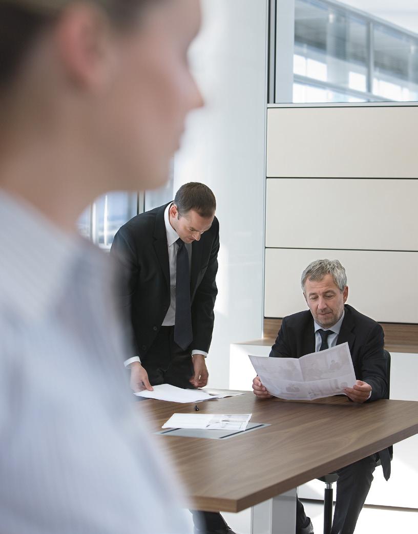 EINE UMGEBUNG, in der sich konzentriert und kommunikativ arbeiten lässt. P2 Group. Ein wandorientiertes, hochwertiges Möbelensemble für kompakte Managementarbeitsplätze in Rechts-, Finanzdienstleistungs- und Consultingunternehmen etc.