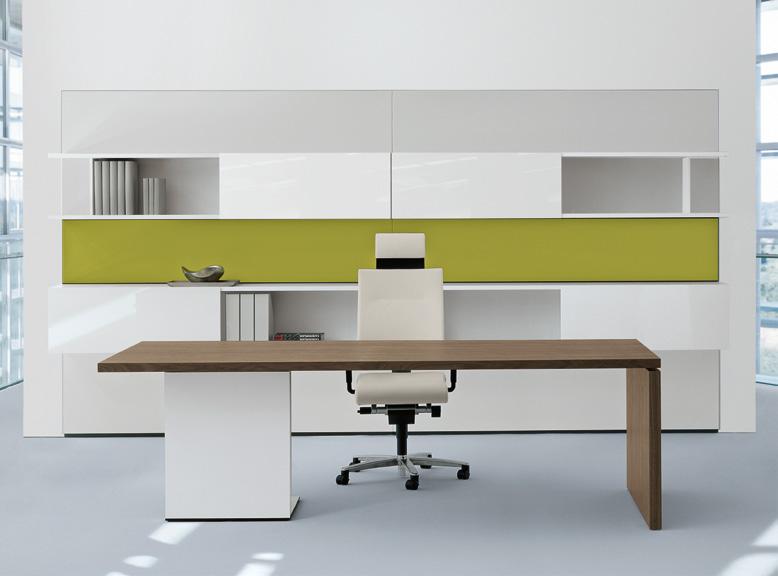 Clear table surfaces symbolise a superior style of working. The inset slab with base plate is an important design element of a new kind of executive desk. Room layout with wall cabinets.