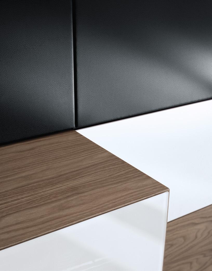 Attractive wall solutions in a combination of faux-leather wall coverings, veneers and high-gloss surfaces.