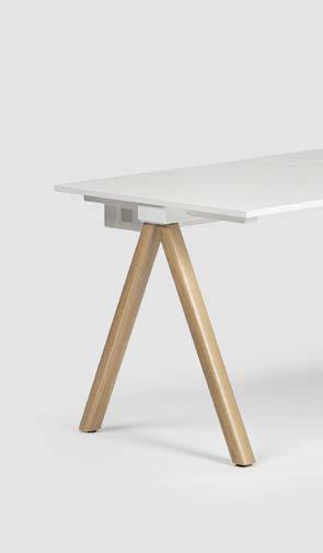 A solid desk for alternating at work between sitting and standing. T-leg or C-leg frame with 10 mm floor compensation, various tabletop shapes of 13 mm, 19 mm, or 25 mm thickness and 2 mm or 3 mm edge.