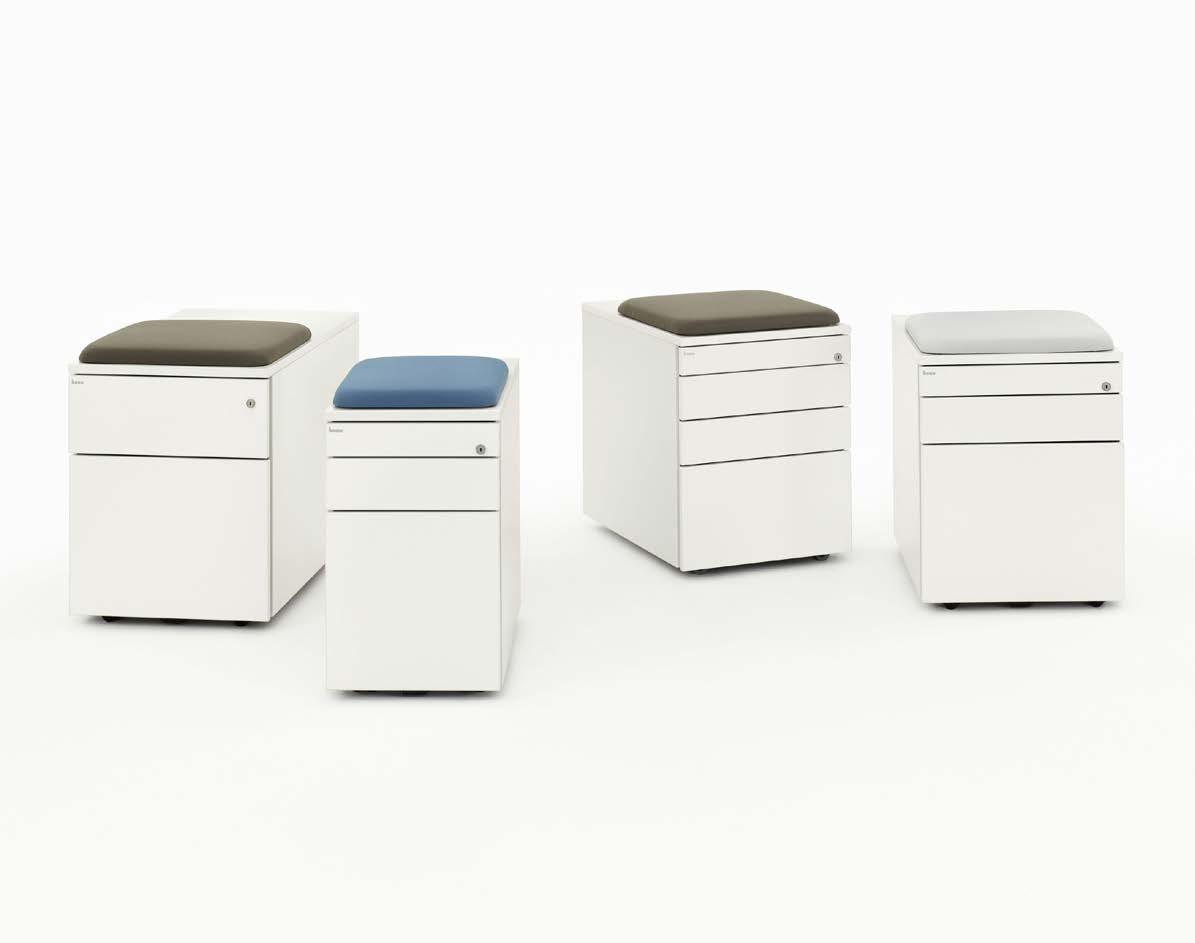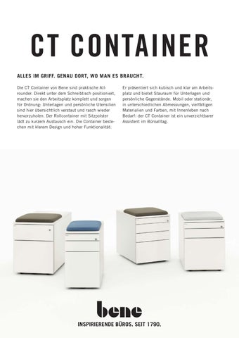 Die CT Container von Bene sind praktische Allrounder. Direkt unter dem Schreibtisch positioniert, machen sie den Arbeitsplatz komplett und sorgen für Ordnung: Unterlagen und persönliche Utensilien sind hier übersichtlich verstaut und rasch wieder hervorzuholen. Der Rollcontainer mit Sitzpolster lädt zu kurzem Austausch ein. Die Container bestechen mit klarem Design und hoher Funktionalität.