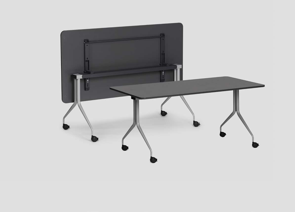 Tischplatte schwenkbar, raumsparend und staffelbar, Entsperrung durch Betätigung zweier Verrieglungshebel, bestens geeignet für Büro, Trainings- und Konferenzräume, leicht von einer Person zu bewegen