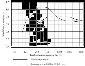 Bewerteter Schallabsorptionsgrad α w 0,80 (im akustisch aktivierten Bereich), Absorberklasse = B