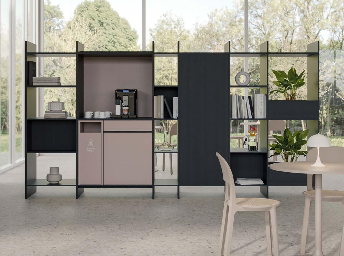 Es kann eine Recycling Station und/oder ein Einschubschrank eingebaut werden, der die gesamte Breite der Nische einnimmt. Durch unterschiedliche Konfiguration kann das Modul beispielsweise als Teeküche, Druckernische oder für Müllentsorgung verwendet werden. Zusätzlich besteht die Möglichkeit der Verkabelung. Die Breite 921 mm wird automatisch mit Versteifungsschienen oben und unten (an der Unterseite des untersten Fachbodens) ausgestattet.