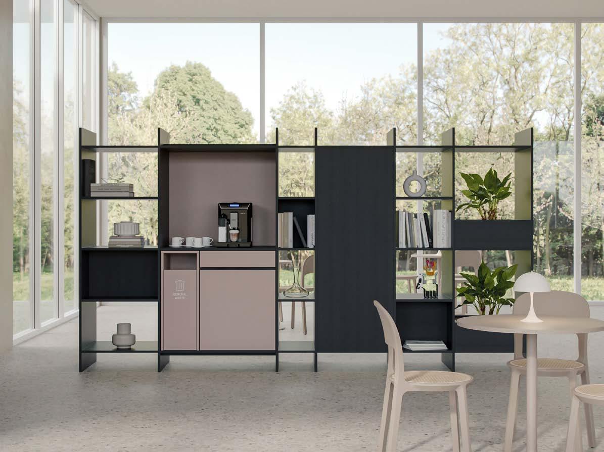 das Regal einzigartig und individuell konfigurierbar. Dank vordefinierter Module lassen sich vielseitige Funktionen kombinieren – von Raumtrennung, offener Ablage, Stauraum und Garderobe über Locker bis hin zu Pflanzwannen und Druckerinseln. Auch Teeküchen, Pinnflächen, Whiteboards sowie digitale Präsentationsflächen können in das Panel Rack integriert werden.