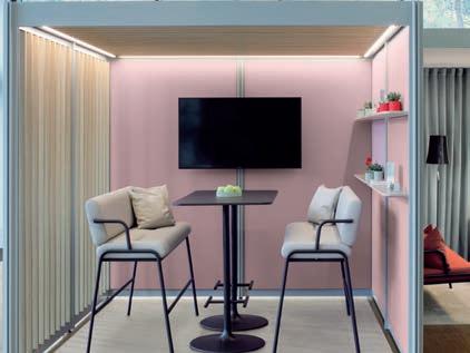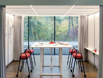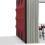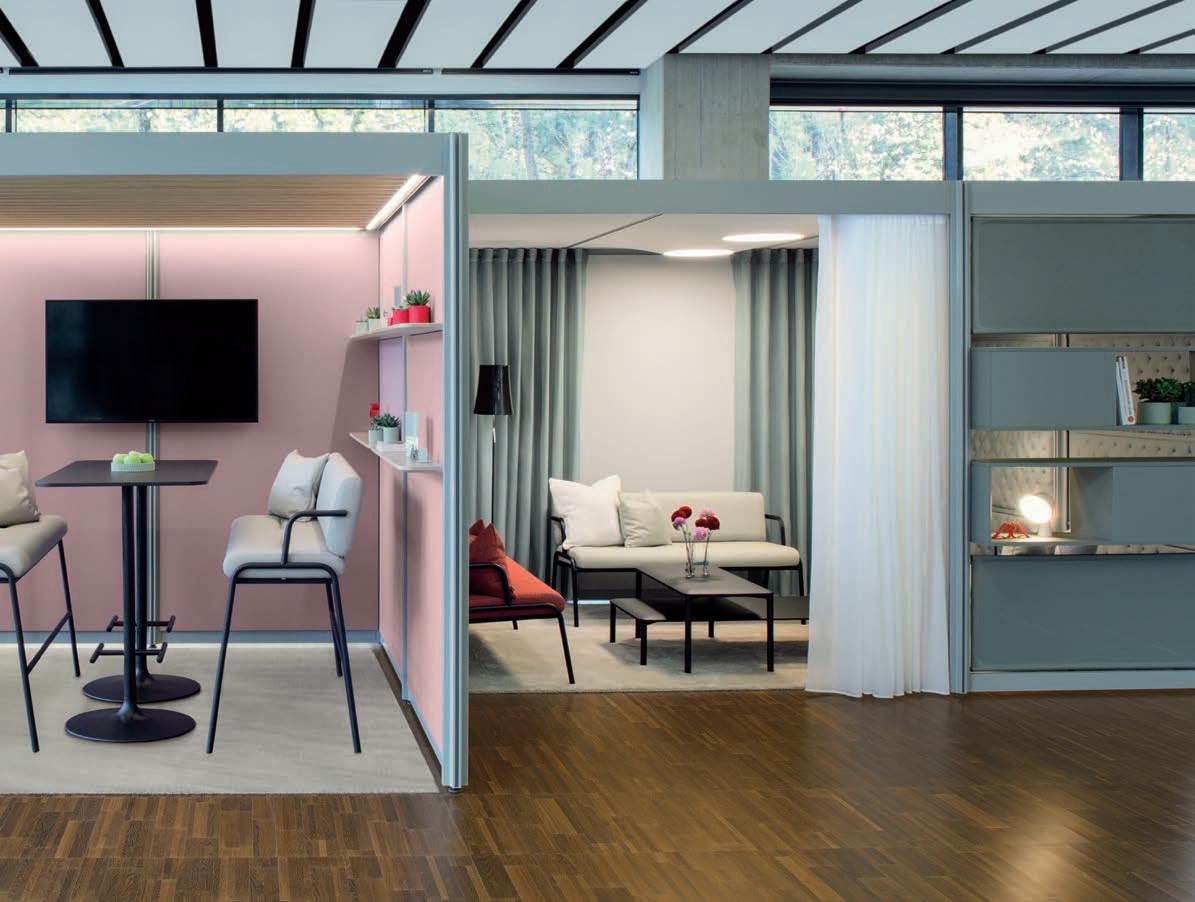 Infills in verschiedenen Materialitäten, Texturen und Farben zur Verfügung. Durch die Kombination der unterschiedlichen Gestaltungselementen mit Beleuchtungsoptionen, additiven Elementen und Accessoires kann das gewünschte Ambiente geschaffen werden. Vorhänge in verschiedenen Ausführungen garantieren besonders in Lounge- und Kommunikationsbereichen Gemütlichkeit. Regale aus Melamin oder Furnier ergänzen das Portfolio und bieten Stauraum.