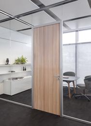 Drehtür mit Zarge, Absenkdichtung und durchgehendem Türband für hohe akustische Anforderungen. Ausführung raumhoch oder mit Glasüberbau, ein- oder zweiflügelig, zum Einbau in ein- und zweischalige Glaswand.