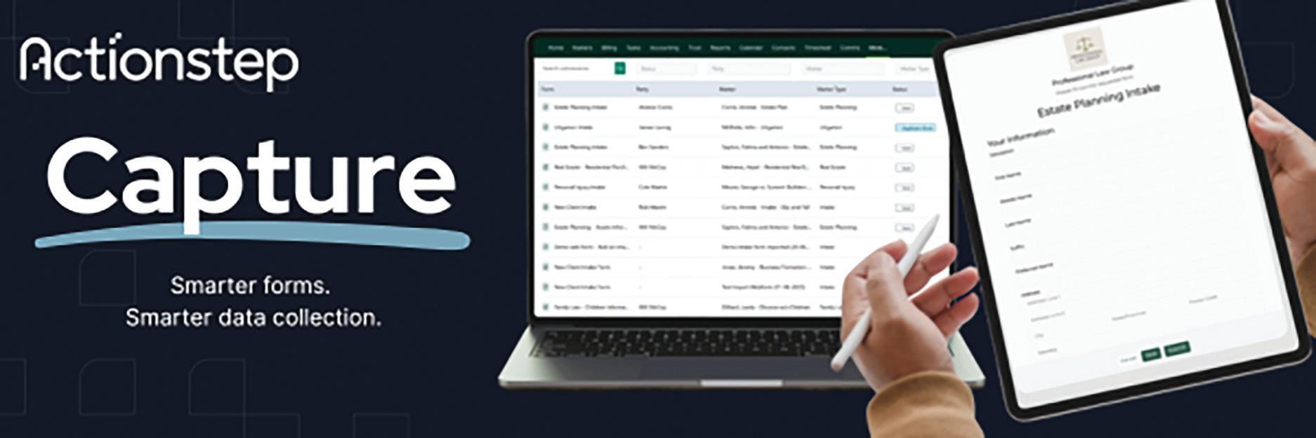 That’s why Actionstep built Capture: an intuitive forms solution that streamlines data and file collection for law firms and clients, eliminating manual entry and accelerating onboarding.