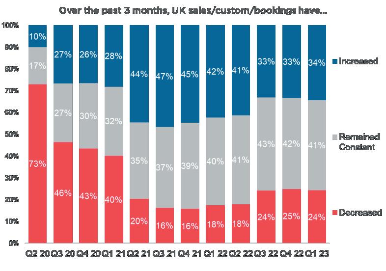 Overall, 34% of respondents reported an increase to domestic sales, while 24% reported a decrease, largely unchanged from Q3 and Q4.
