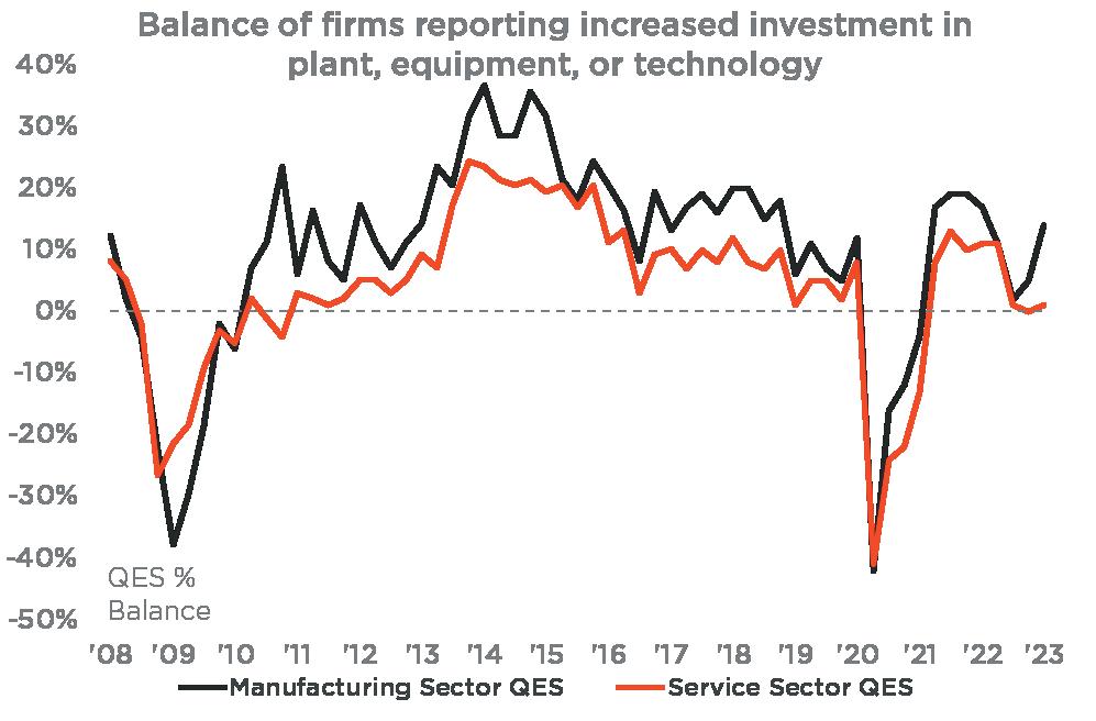 Overall, 25% of respondents reported an increase to plant/equipment investment in the past three months, while 56% reported no change, and 19% reported a decrease.