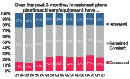 A quarter (24%) of businesses say they have cut back on investment plans, while 56% say they have remained unchanged, and just 21% of firms increased their plans.