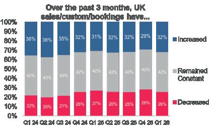 42% reported no change, and just over a quarter (26%) said they had seen a decrease in sales. Sectoral breakdowns show increased sales were at their lowest among transport (25%) and manufacturers (26%)