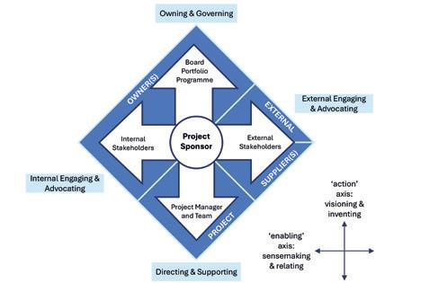 • Internal engaging and advocating: the project sponsor communicates and negotiates with the internal stakeholders within the owner group(s) – including other related projects – developing relationships, collecting information on what is happening in and around their project, but also acting as an advocate for the project, championing it within the owner organisation(s)