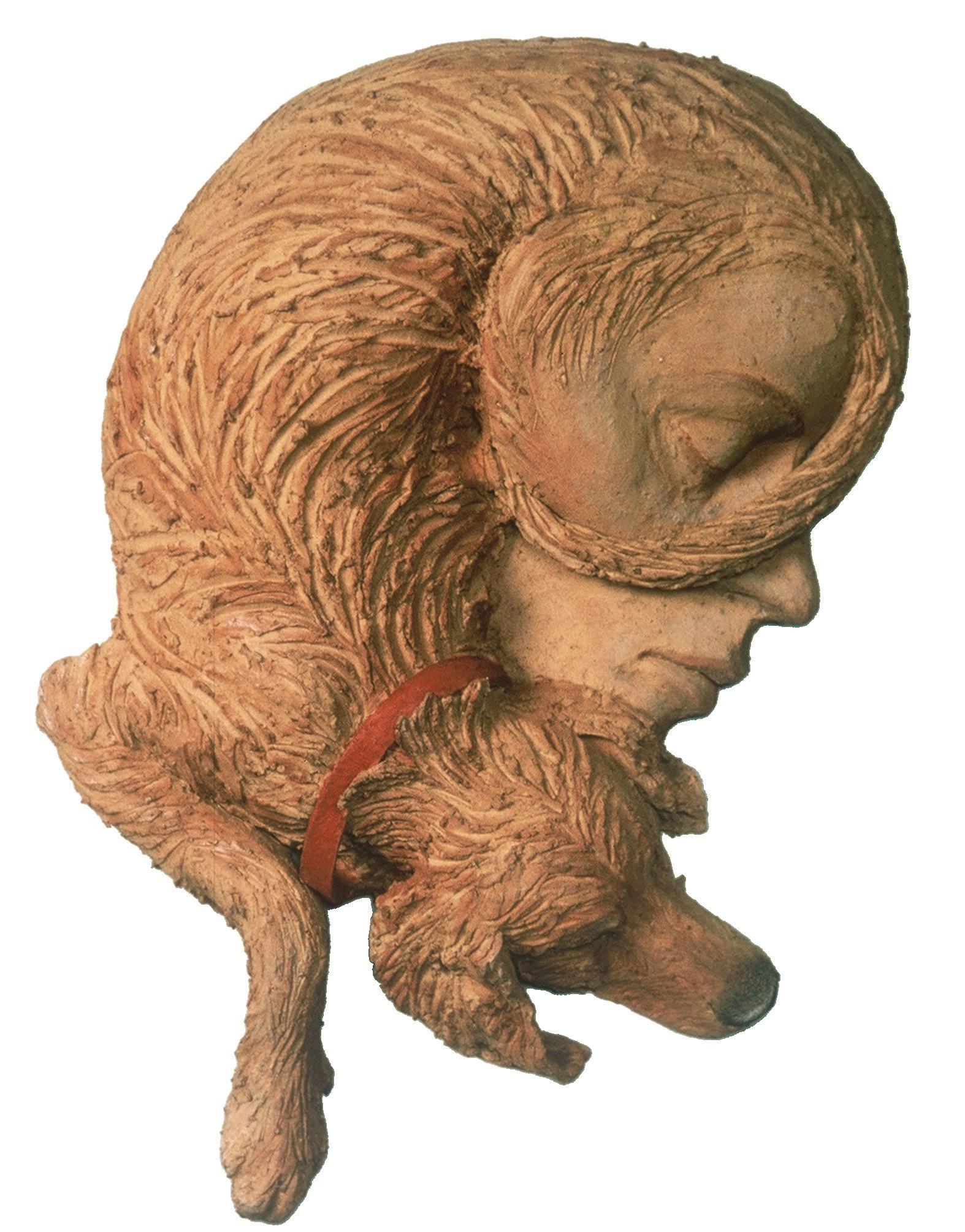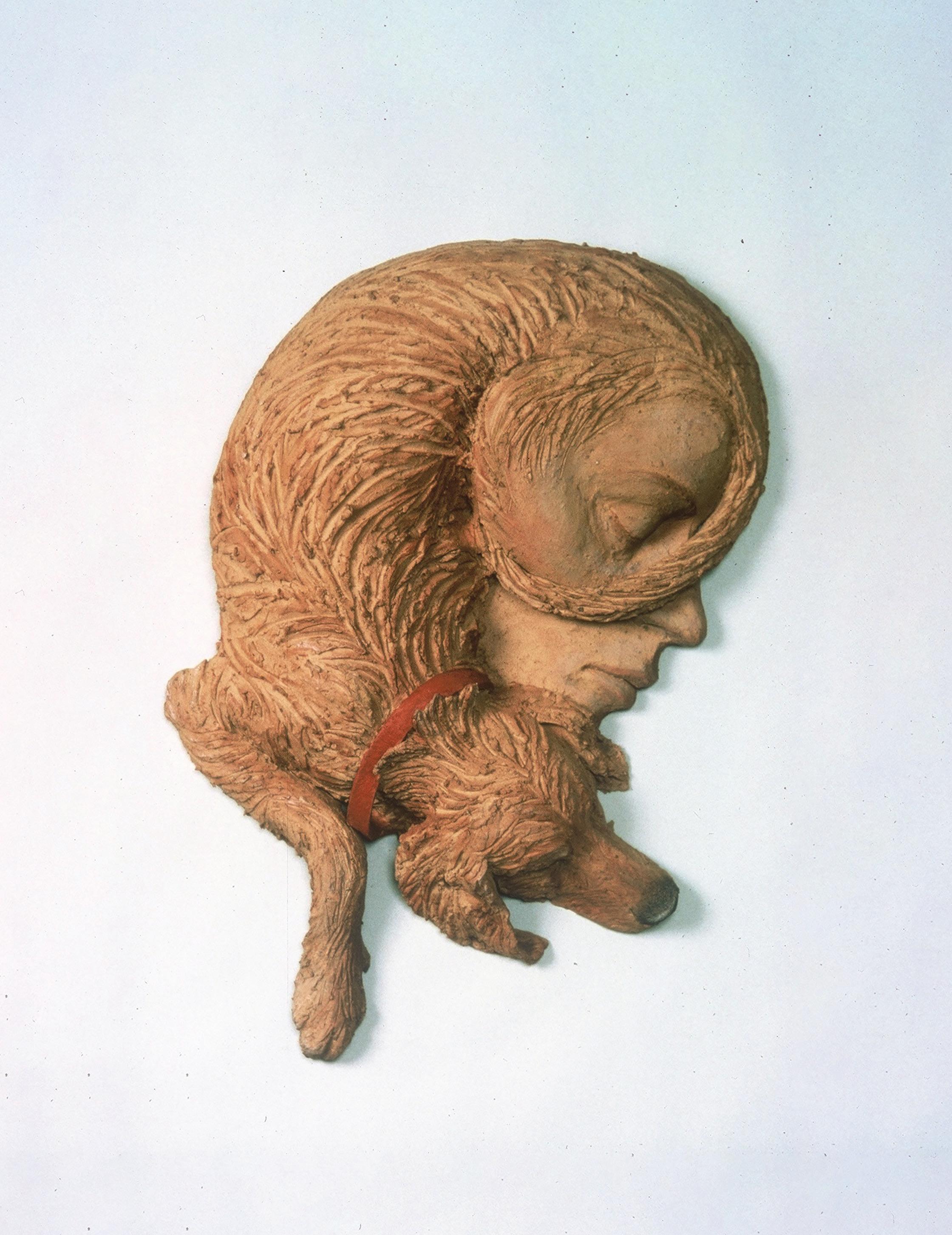 “I am interested in our relationships with the other living beings on this earth. Our actual relationships, as with dogs, and also how animals show up in our mythologies and fairy tales, and what those stories reflect about us.” Lisa created the sculpture "Dreamer" from a doodle she made of her dog sleeping. “I incorporated my face into the dog, which could be my, or the dog's dream. Hanging it on the wall also added to the surreal sense of the artwork. My work combines realism with a contemporary expression of social and psychological content. My dogs are the greatest friends. We go hiking and experience the joy in nature together. It was natural to have them become muses and models for my art.”