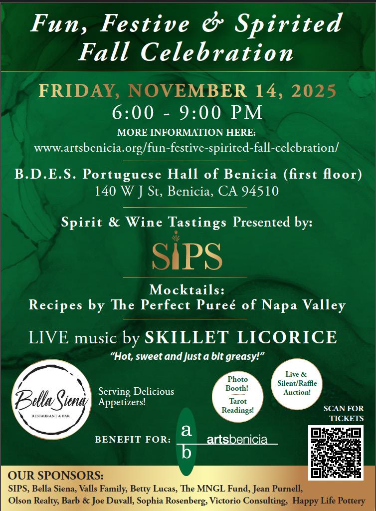 Get ready to be part of something extraordinary at Arts Benicia's Fun , Festive & Spirited Fall Celebration. It will be an event like no other... and we would love for you to join us!