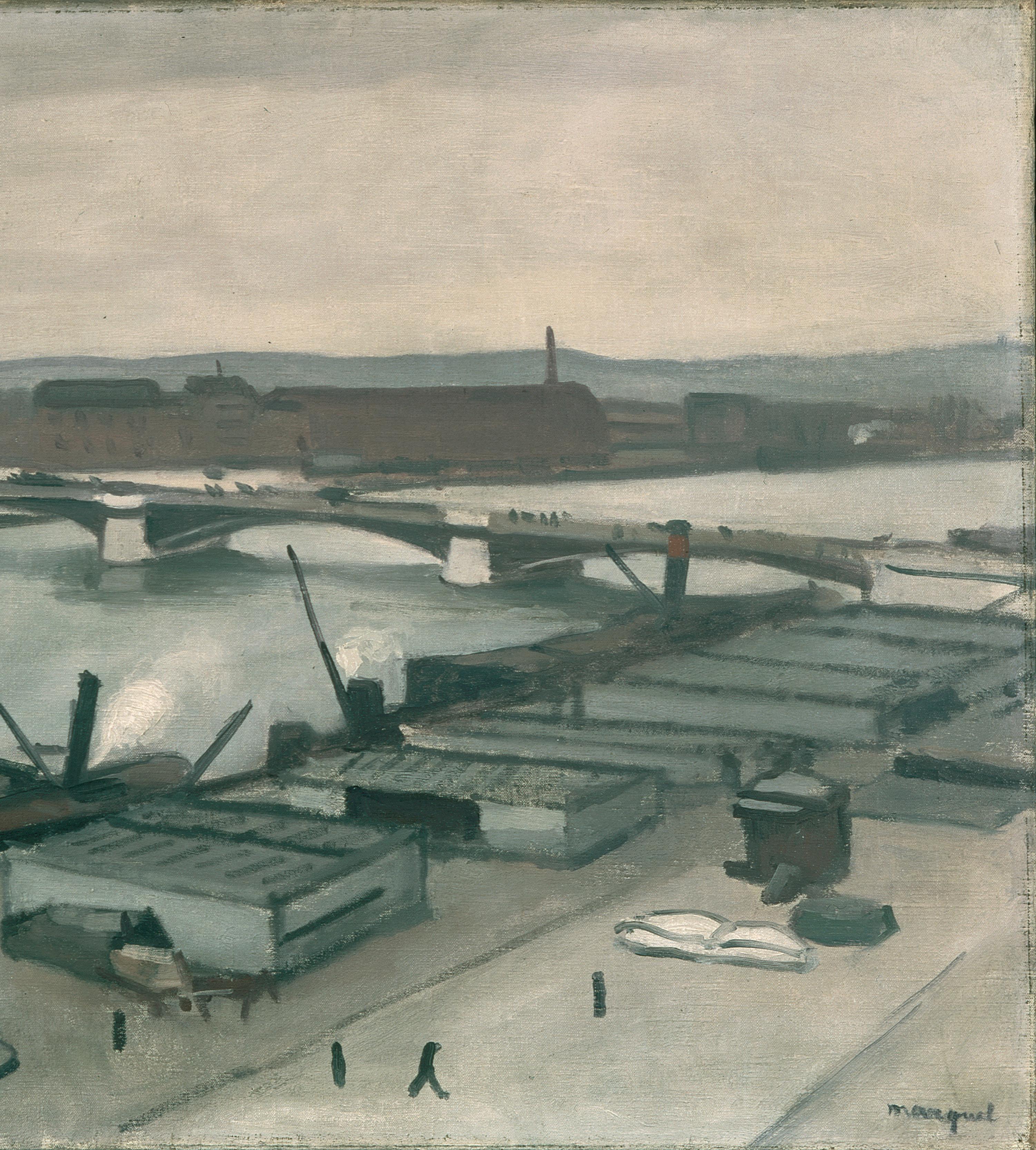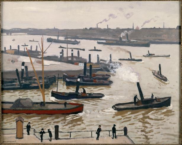 Dans cette grisaille qu’il affectionne, il peint d’autres ports industriels auxquels il agrège le va et vient incessant des bateaux crachant les fumées blanches ou grises : Hambourg, Rotterdam, Boulogne, Rouen, Marseille, Alger qui possèdent presque tous les mêmes caractéristiques : le quai et les docks, les bateaux - on a bien surnommé Marquet, « le peintre de remorqueurs » , la ville, mirage ou silhouette dans une brume qui dissout toutes les architectures.