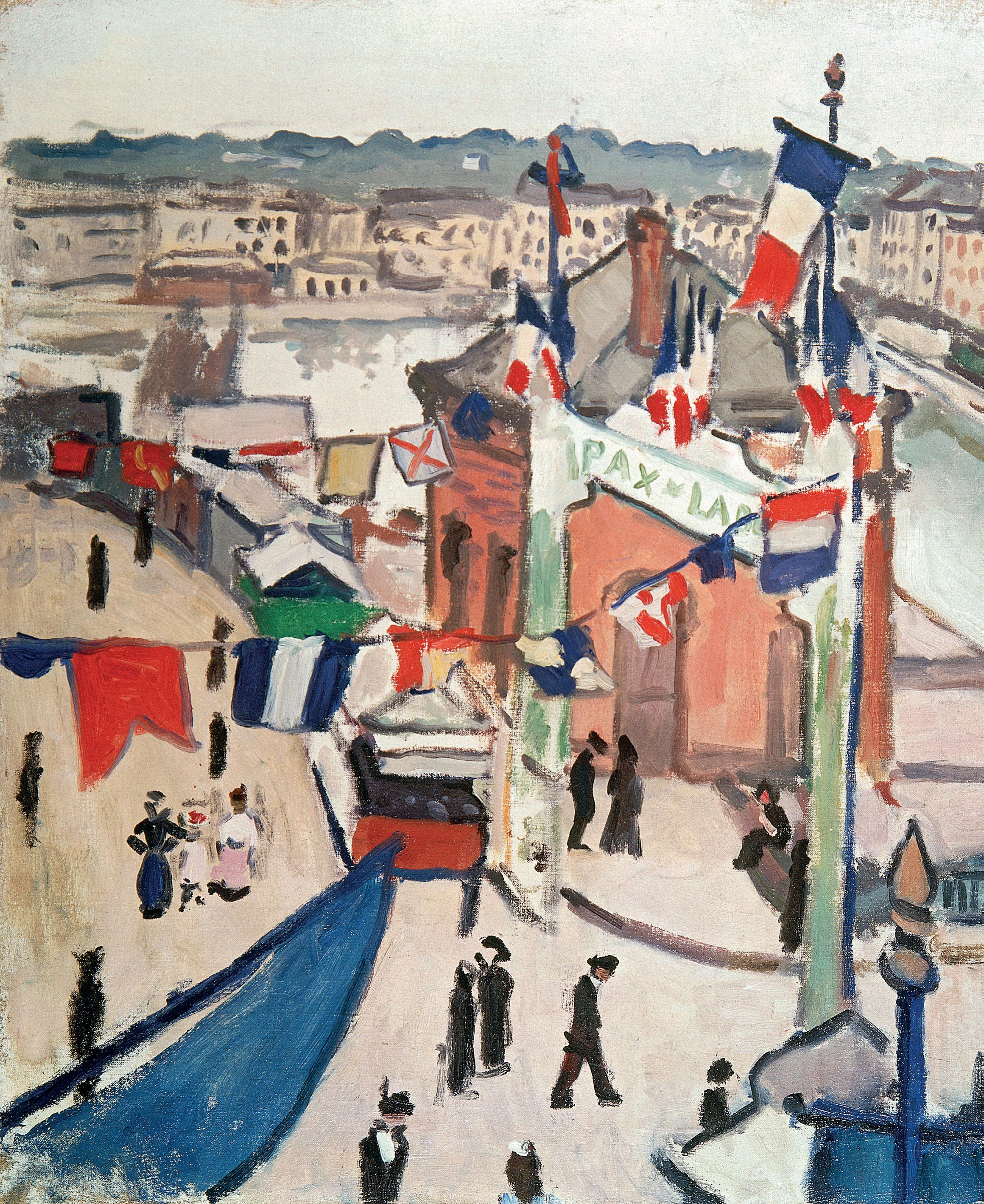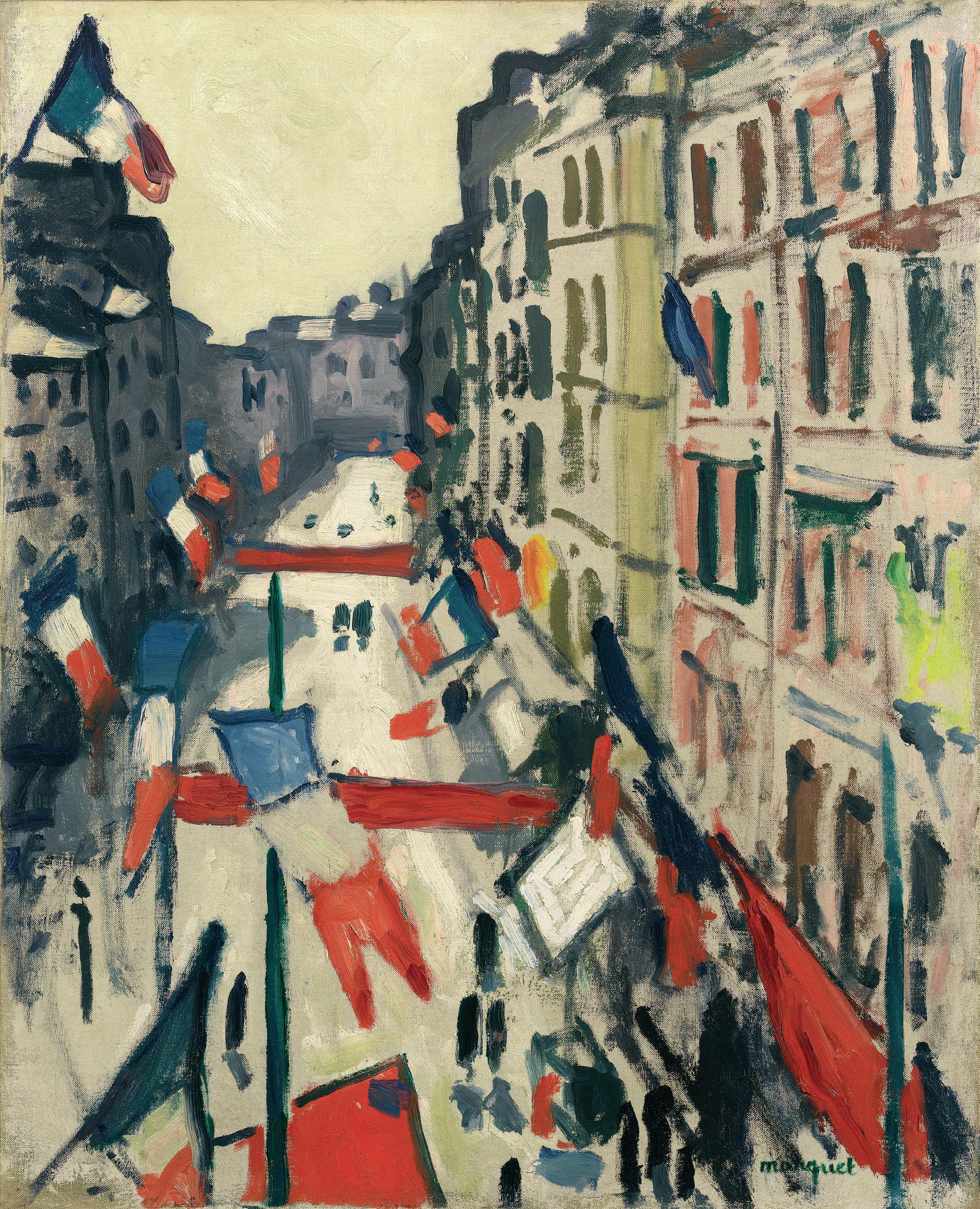 A l’instar de Monet, Marquet et Dufy peignent des rues pavoisées mais différemment : Dufy en peint plusieurs et cherche, tout en bouchant la perspective, par transparence et l’opacité des drapeaux bleu blanc rouge, à décrire un coin de rue où les badauds pantalons blancs et canotiers