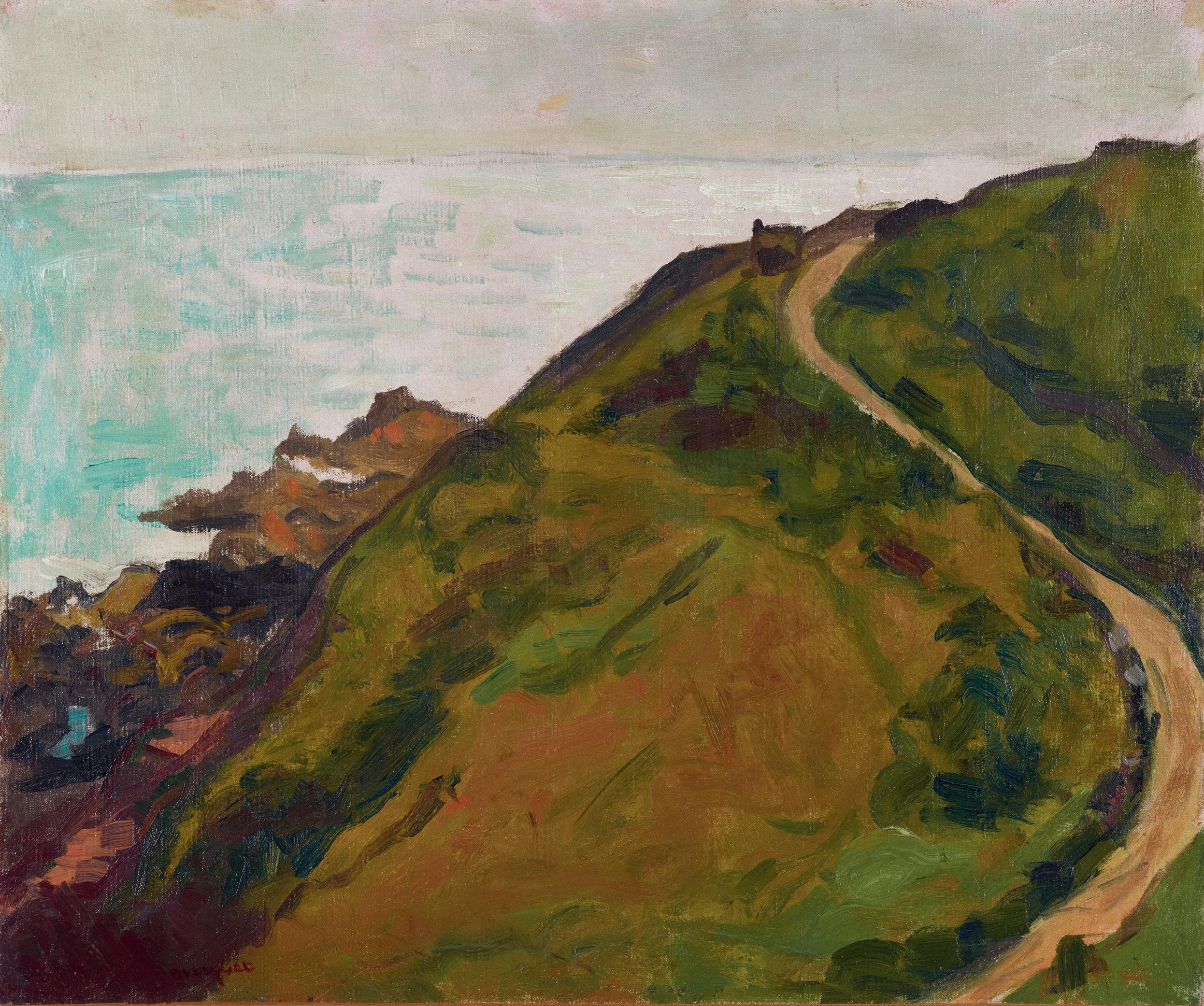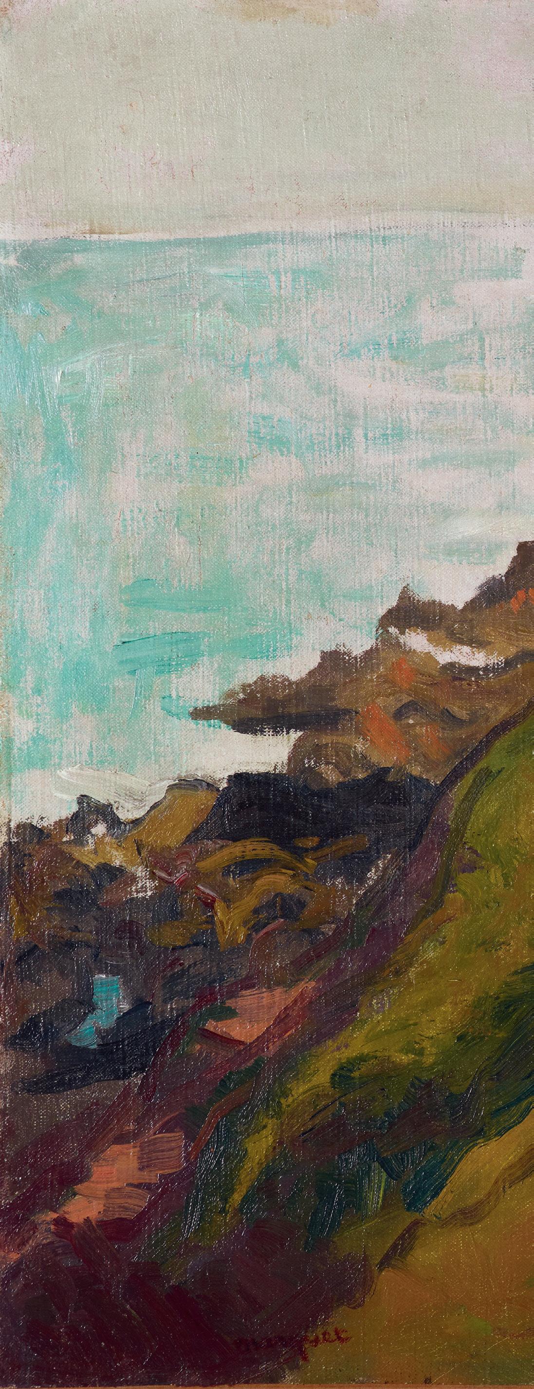 C’est une nature sauvage et âpre que les deux peintres découvrent. Cela n’a rien à voir avec l’harmonie du Sud que les deux peintres arpenteront l’année suivante. Les deux peintres ont une sensibilité différente au paysage. Manguin encore sous l’influence de la tradition de la peinture claire sans pour autant retourner à l’impressionnisme montre un point de vue bien construit où sourd la couleur. Marquet reprend cette falaise aux rochers très découpés avec une composition identique mais gauchissant les détails et dont les coloris sont plus austères dans un chromatisme plus dur. D’ailleurs, Manguin s’éloigne définitivement de la France septentrionale pour se réfugier dans le Sud où les contrastes sont plus marqués, les couleurs plus violentes et les paysages élégiaques plus à même d’être le cadre de ses scènes familiales intemporelle. Marquet, quant à lui, n’aimera pas trop le Sud et ne s’intéresse pas exclusivement à la couleur reviendra souvent sur la côte atlantique, se passionnant pour les ports.