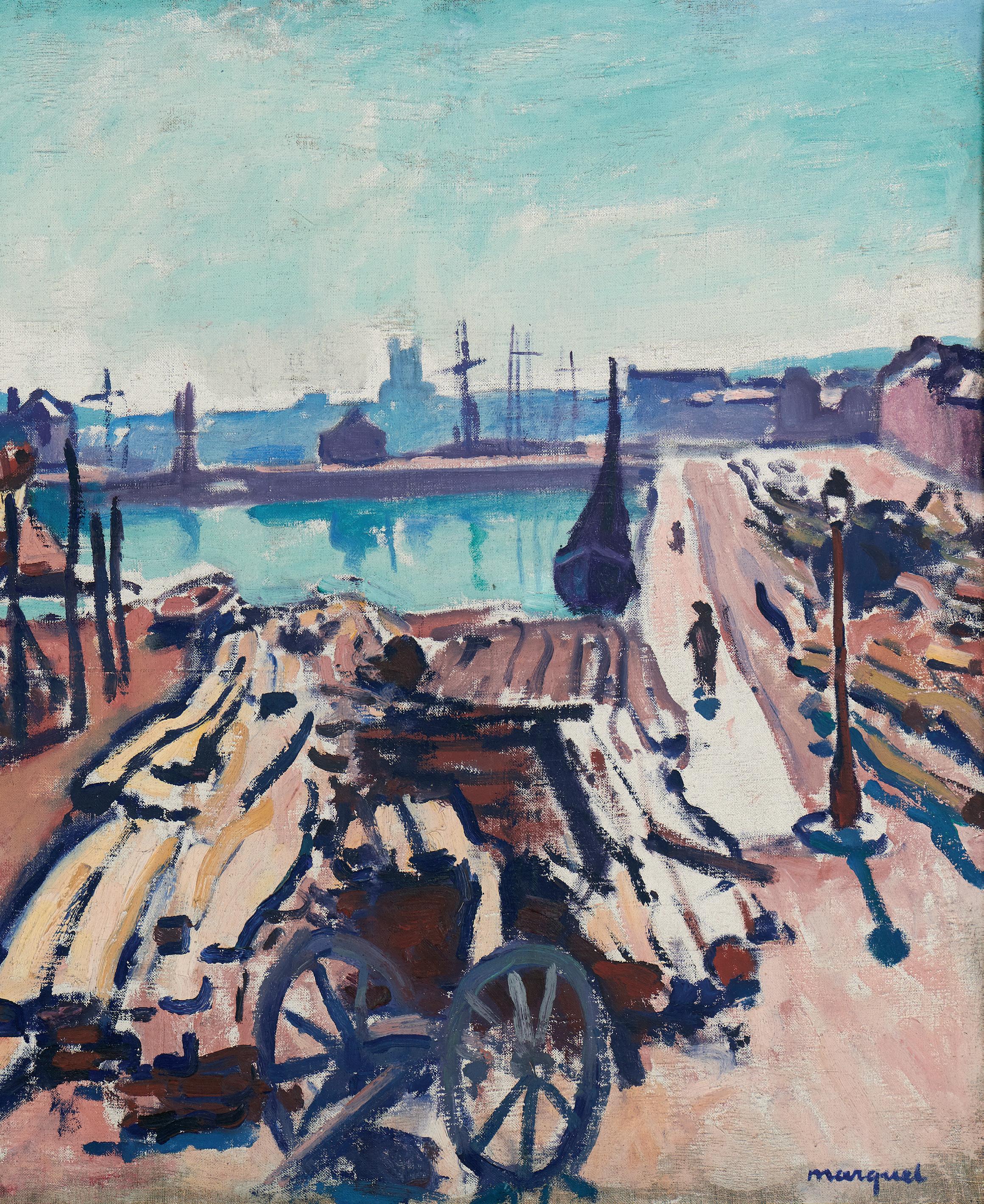 Cette virée entre peintres amoureux du paysage, de la fête et des couleurs reste un des moments forts dans la carrière des deux artistes. Leur émulation les conduit à peindre le port du Havre en fête, la plage au Havre et à Sainte Adresse, avec sa célèbre estacade mais aussi les affiches à Trouville, la falaise de Fécamp , autant de motifs restés attachés à sa brève période « fauve ». Jamais Marquet n’a été aussi audacieux. Mais c’est bien au Havre qu’il construit en grande partie sa vision du paysage, du port en particulier avec ses quais et ses docks qu’il poursuivra toute sa vie. Plus raides que les compositions plus colorées et virevoltantes de Dufy, ses peintures sont parfaitement cadrées et synthétiques. La couleur joue un rôle structurant notamment avec le noir qui est à la fois cerne et couleur. Ce port d’où commence son expérimentation artistique, lui apporte autre chose que la contemplation, à l’instar des vues de Claude Gellée ou de Joseph Vernet , les inventeurs des vues de port. Point de vision grandiose ni de reportage sur la marine ou l’architecture portuaire, Marquet essaie de rendre compte de la vie, une vie populaire, prolongement de la rue. Marquet est fasciné par le spectacle du chargement ou du déchargement de tonneaux et autres marchandises, de la valse des grues, du va et vient des charrettes à cheval, des baraquements précaires qui servent alors de docks, du fourmillement des dockers sur les quais, des mâts se reflétant dans l’eau, des coques ovales des bateaux accolés les uns aux autres, de l’alignement des immeubles disparates peintes comme des silhouettes et bien sûr de l’eau. Tout ceci donne à l’artiste les motifs à sa peinture emprunte d’une certaine naïveté. Ce synthétisme, cette simplification à outrance confère à ses tableaux un caractère apparemment un peu enfantin.