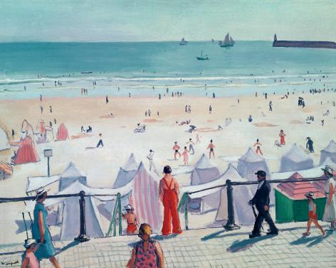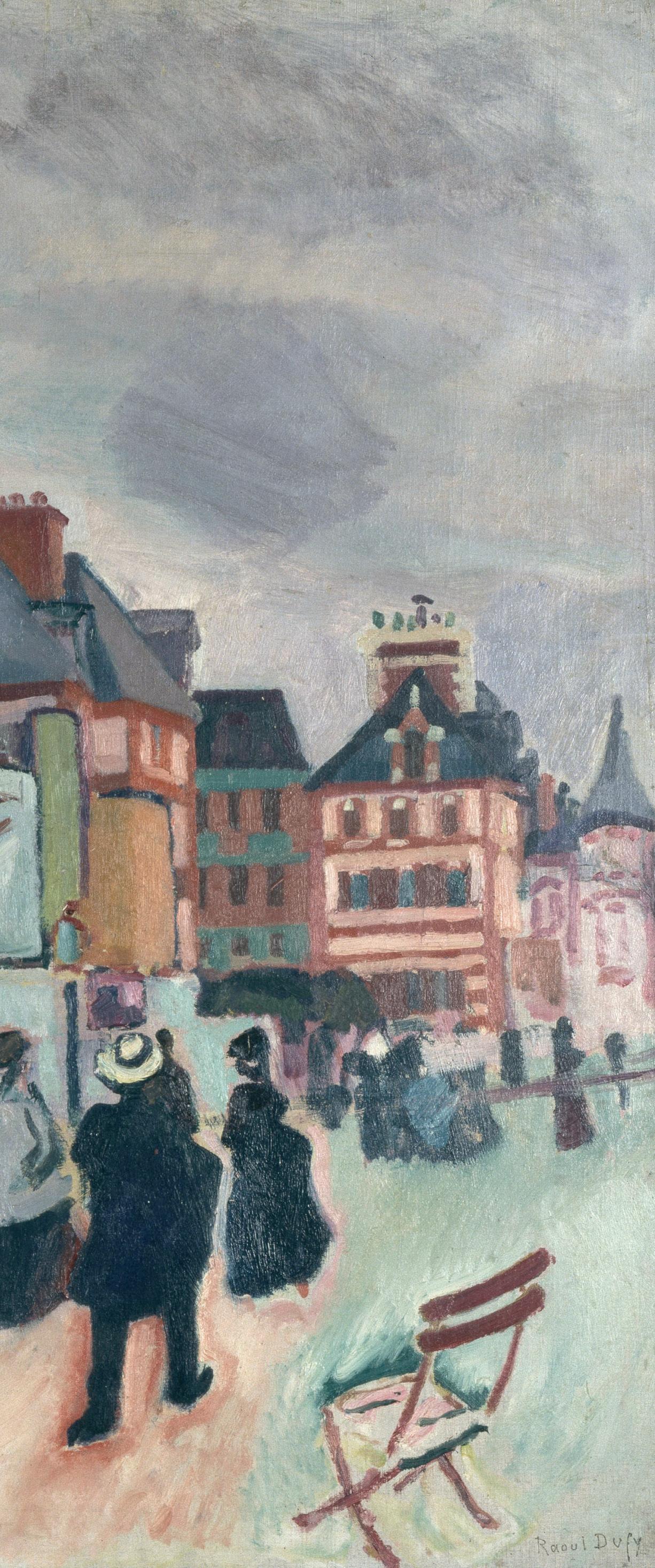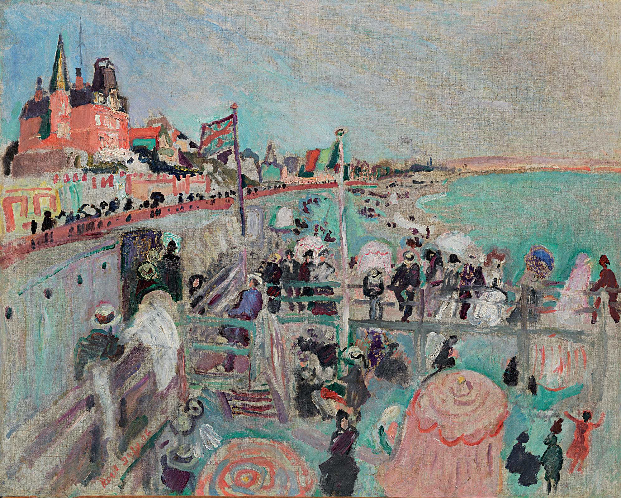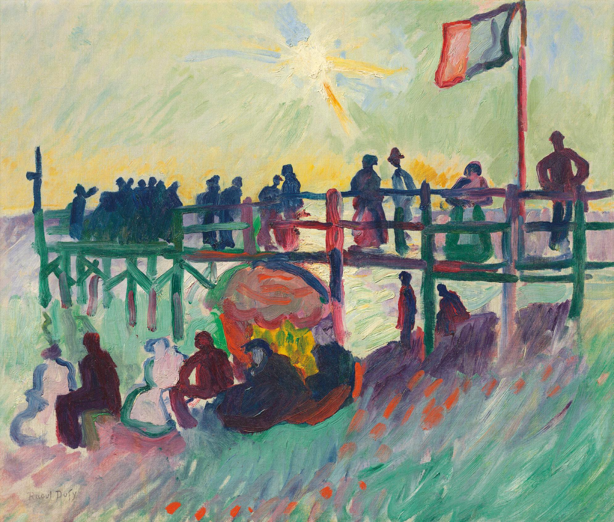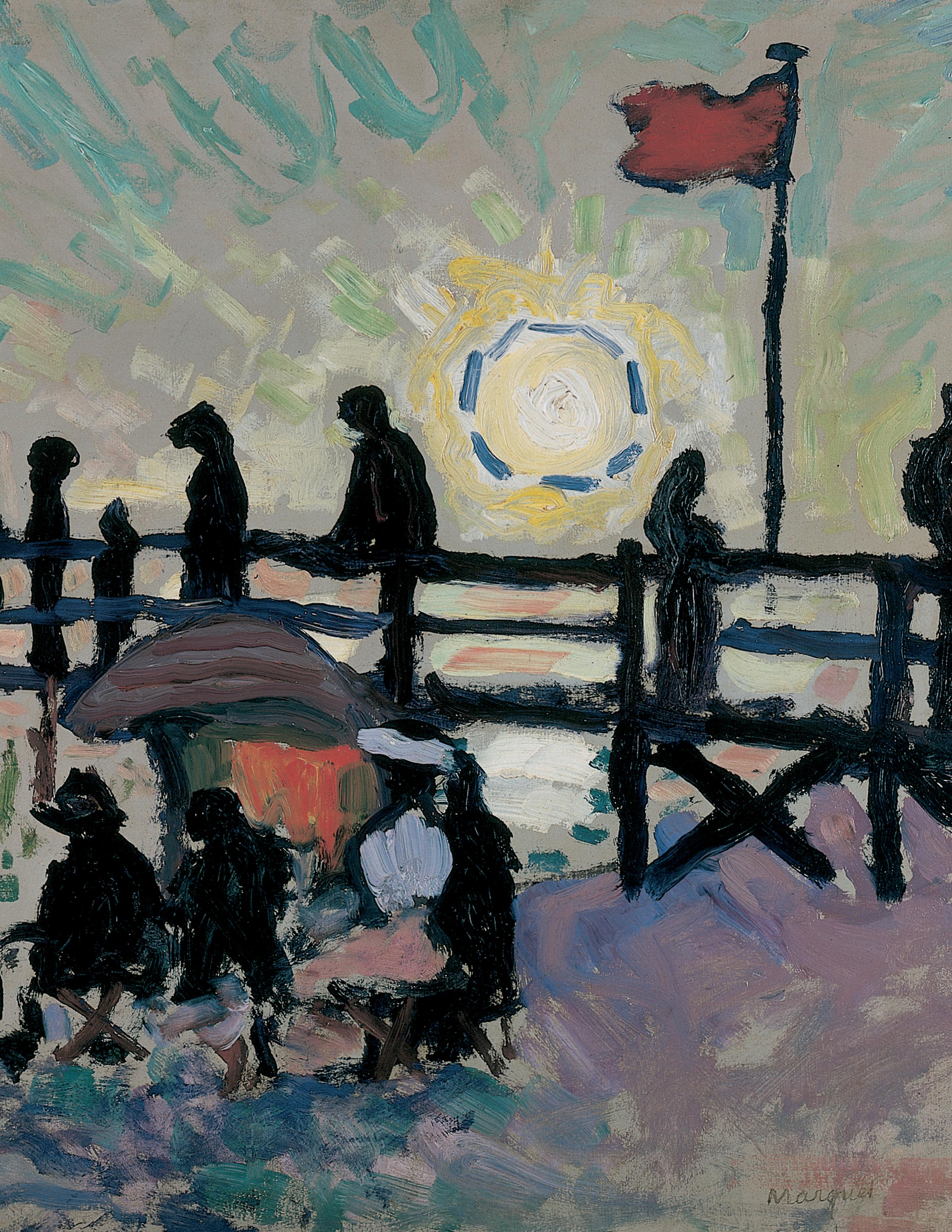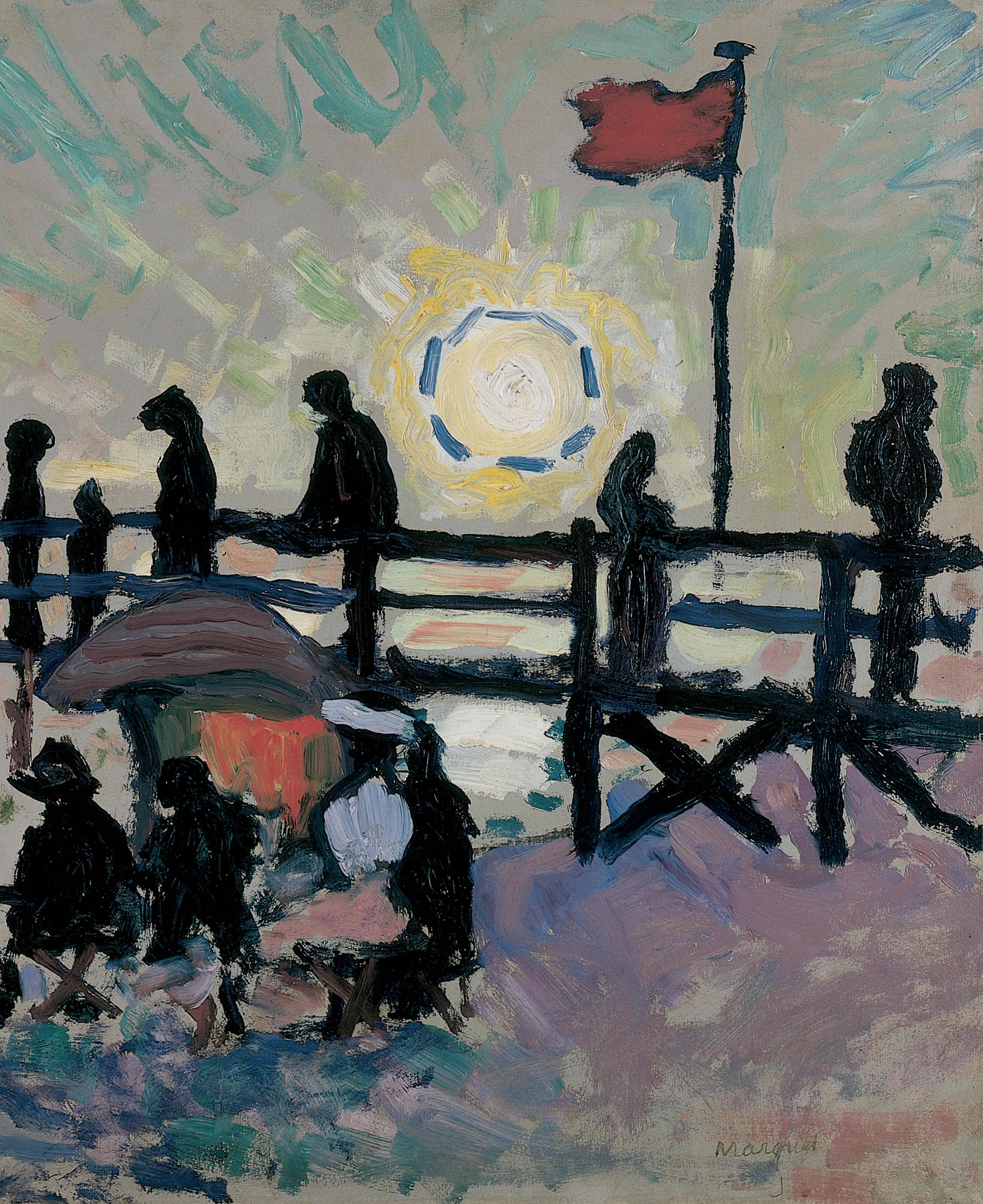 La plage s’inscrit dans cet univers de loisir et de fête avec le Carnaval, la fête foraine, le 14 juillet avec ses rues pavoisées que Dufy et Marquet peignent ensemble reprenant la tradition impressionniste dont stylistiquement ils se sont affranchis.