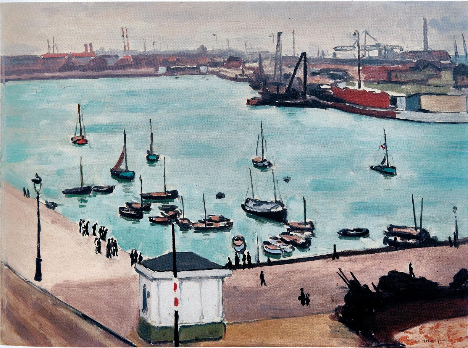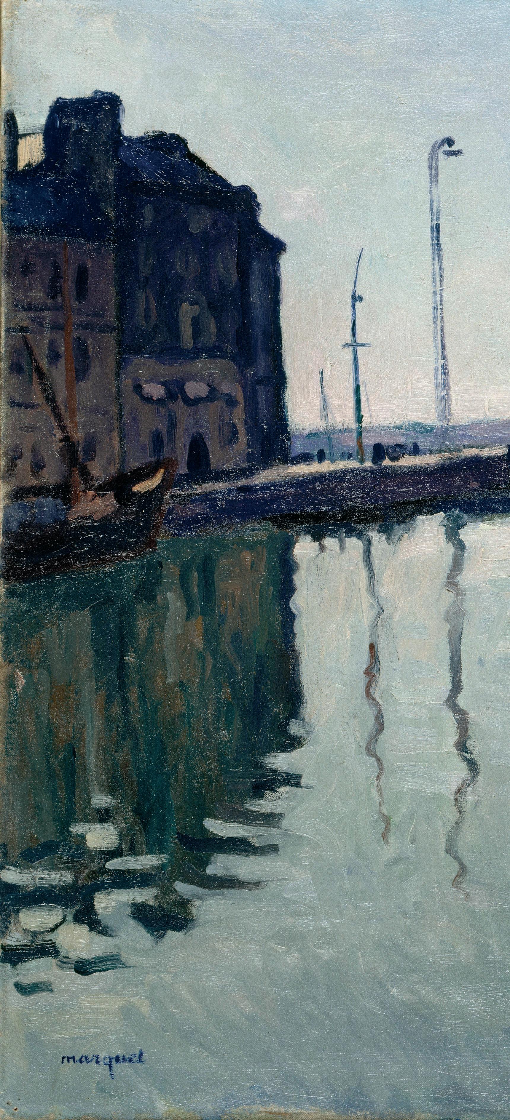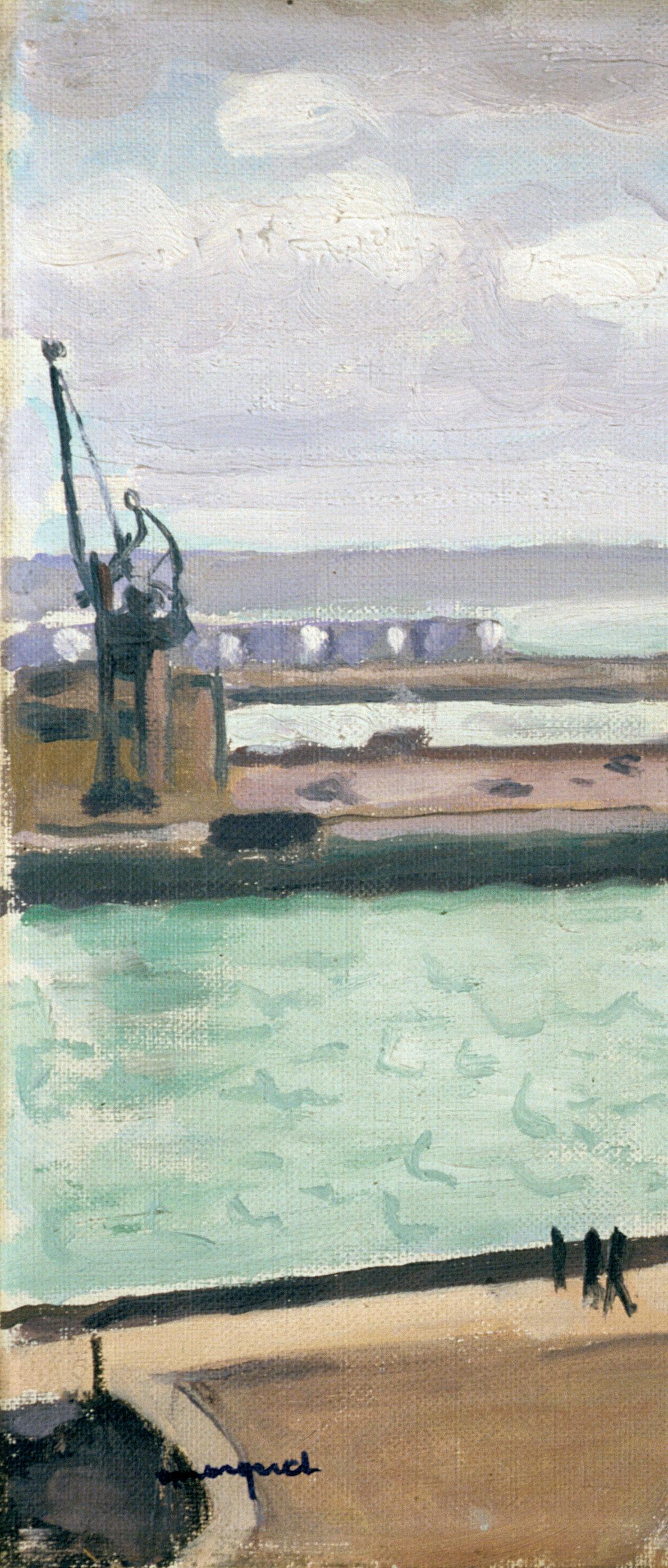 Il préfère un port plus ou moins industriel et populaire. La grue, merveille d’architecture métallique, est l’équivalent du lampadaire pour la rue et joue le rôle du clocher d’église à la fois repère et mire. Marquet se veut moderne au sens baudelairien. Il aime cette vitalité du monde portuaire. Il la saisit grâce à son coup de pinceau elliptique et rapide. Il y trouve une certaine beauté. Il n’est pas le premier à s’intéresser au monde industriel. Il est ami avec Maximilien Luce et de Félix Vallotton et proche de ce milieu symboliste et anarchiste de la Revue blanche. Il ne s’agit pas d’un engagement militant qui insiste lourdement sur la cheminée d’usine fumante ou l’ouvrier torse nu accomplissant des taches pénibles comme le fit Luce. Cela n’intéresse pas l’œil de Marquet. Il contemple tout d’assez loin et en surplomb , ne sélectionnant que quelques détails, et surtout il peint les bassins qui sont de merveilleux miroirs d’eau où se reflètent les façades de maisons, les mâts des bateaux et tout ce qui peut transformer la stabilité en instabilité et brouille l’orthogonalité par un ensemble de lassis et de taches de couleurs.