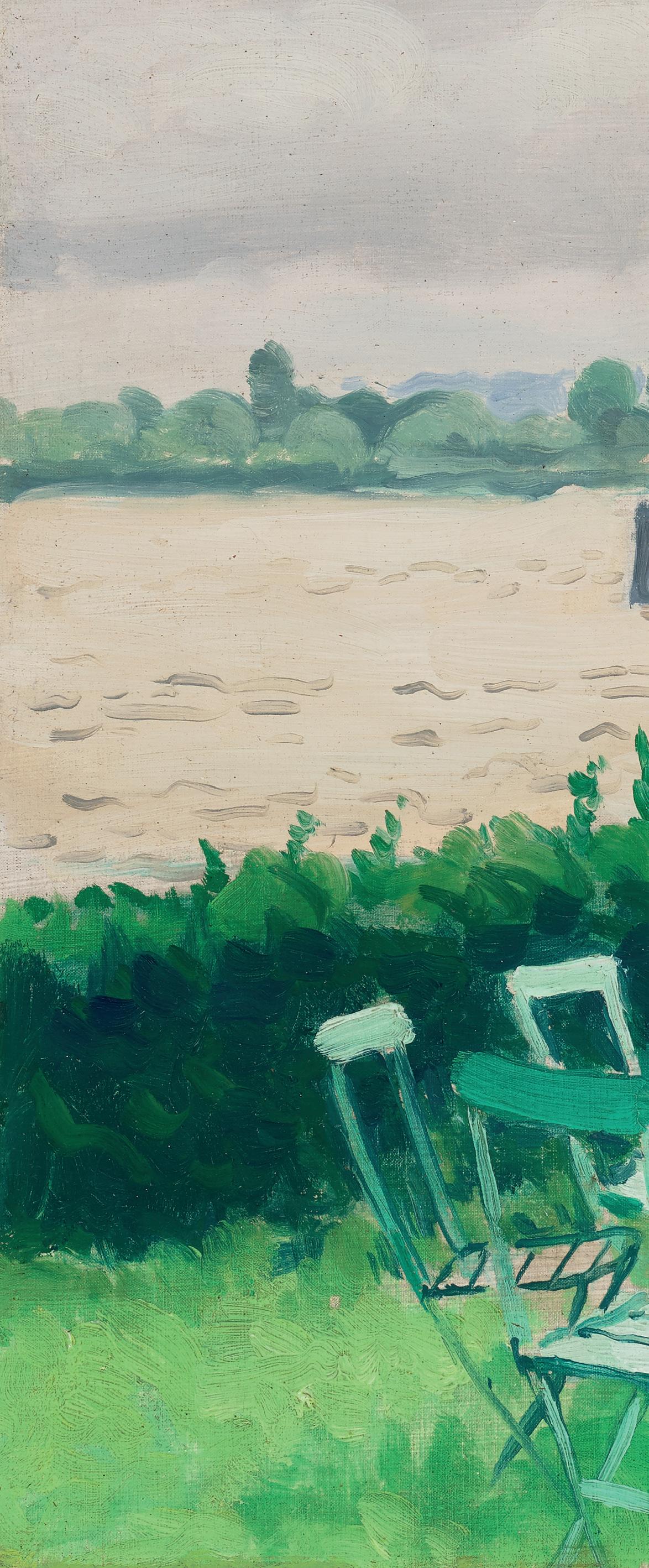 manière inattendue, une chaise. Marquet n’aime pas le vide ou la toile vierge à la différence d’un Dufy qui a toujours su en jouer : tout doit se plier à sa vision. ll reprend le motif de la plage au Pyla, la plage de son enfance, aux sables d’Olonne puis à la Goulette. Pour la toute première fois, il peint des nageurs dans l’eau comme ses petits personnages non plus noirs comme les badauds sur les quais, mais colorés donnant une impression de bonheur et joie de vivre, se fondant dans les ondes vertes et bleues de l’océan.