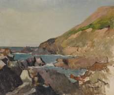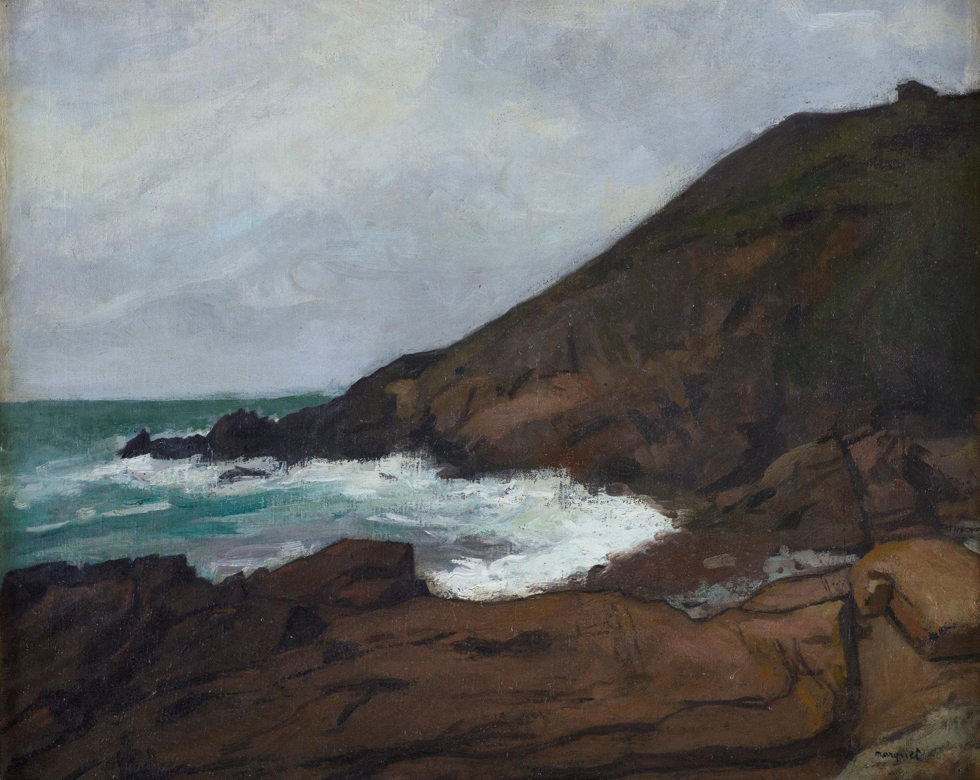 Henri Manguin Rochers de la Percaillerie, 1904D’avant 1904, nous ne connaissons pas de paysage en dehors de ceux de Paris et Arcueil. Ses moyens sont modestes et il n’est pas question de voyager. C’est donc son premier séjour en dehors de la capitale depuis longtemps. On connait une dizaine œuvres peintes à La Percaillerie et aux Pieux. Il s’intéresse aux falaises de l’anse de Sciotot qui lui permettent de composer à l’aide d’une grande diagonale qui sépare la terre du ciel et de la mer. Il utilise une gamme chromatique ocre parcourue de traces vertes qui traduit un paysage lunaire, ces dunes suspendues qu’avait déjà peintes, à son époque, Jean-François Millet.