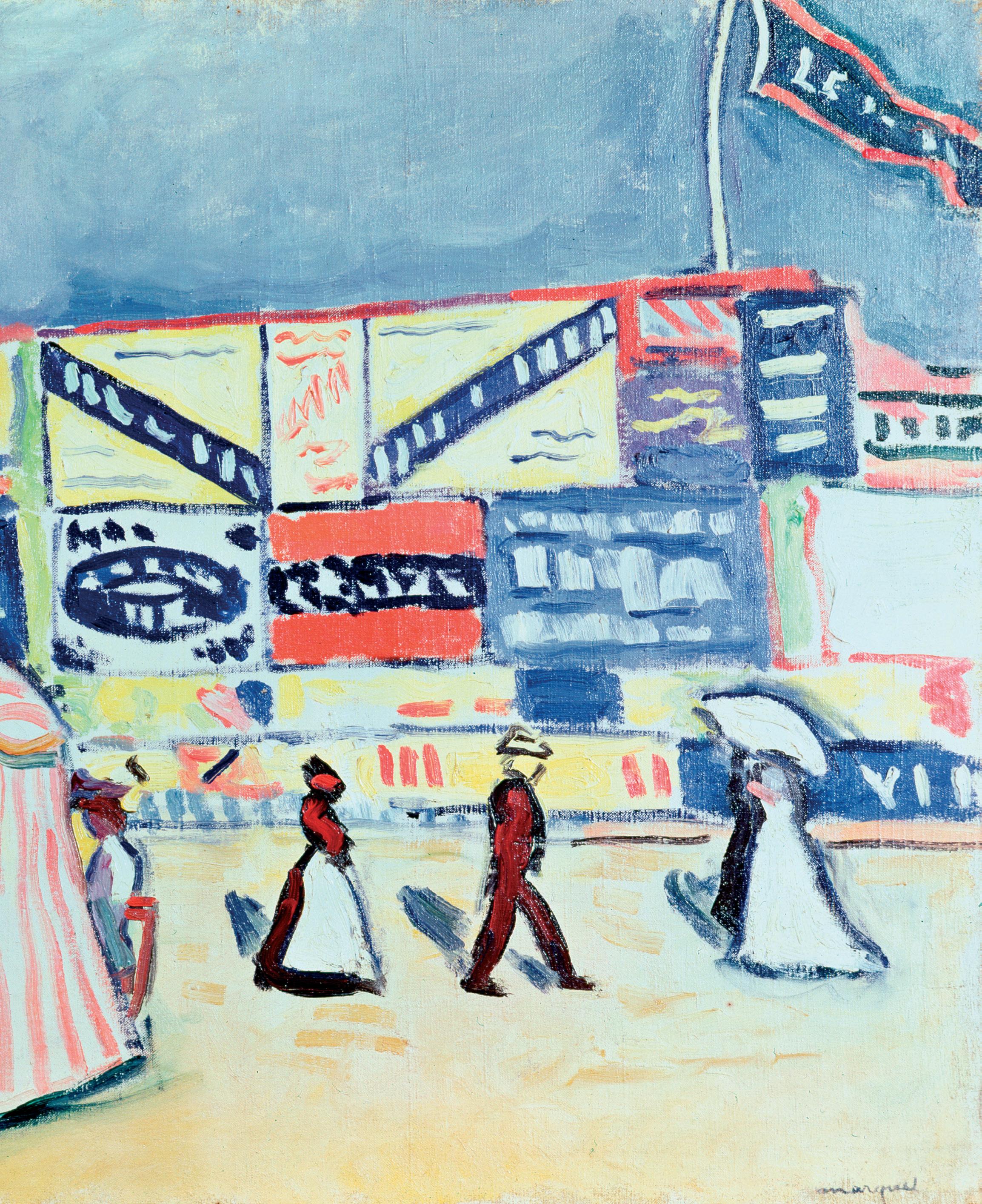 Les personnages chez Marquet restent présents mais discrets, presque toujours en noir. Quand il fait les affiches à Trouville avec le même Dufy, il décide de peindre des passantes et passants endimanchés alternant le blanc et le noir agrandis par leur ombre, de profil et légèrement en contreplongée, le long de la palissade d’affiches publicitaire faites de rectangles des toutes les couleurs et encadrés par deux tentes de plage aux rayures blanches et rouges ; tandis que Dufy, procédant un peu différemment, décide de jouer sur les proportions des personnages pour donner une échelle et donc une perspective, ce qui l’amène à les décrire plus précisément et à utiliser plus de couleur.