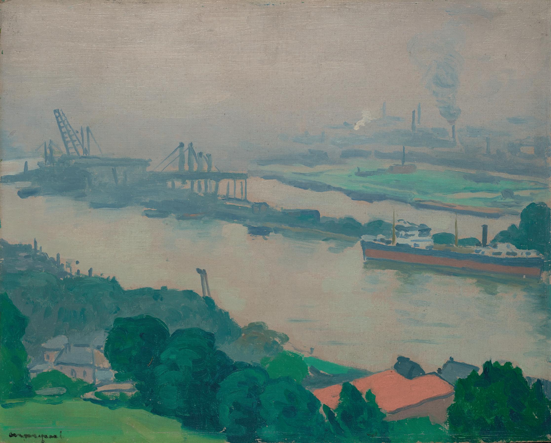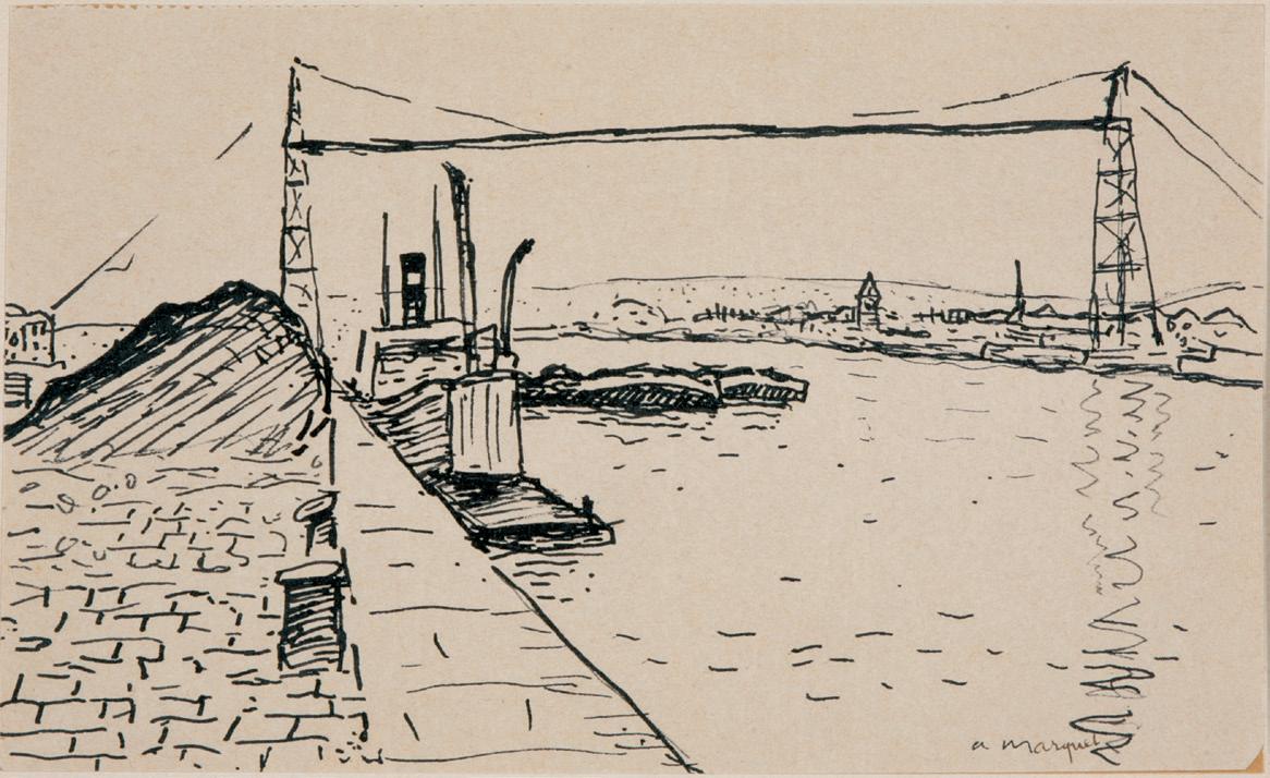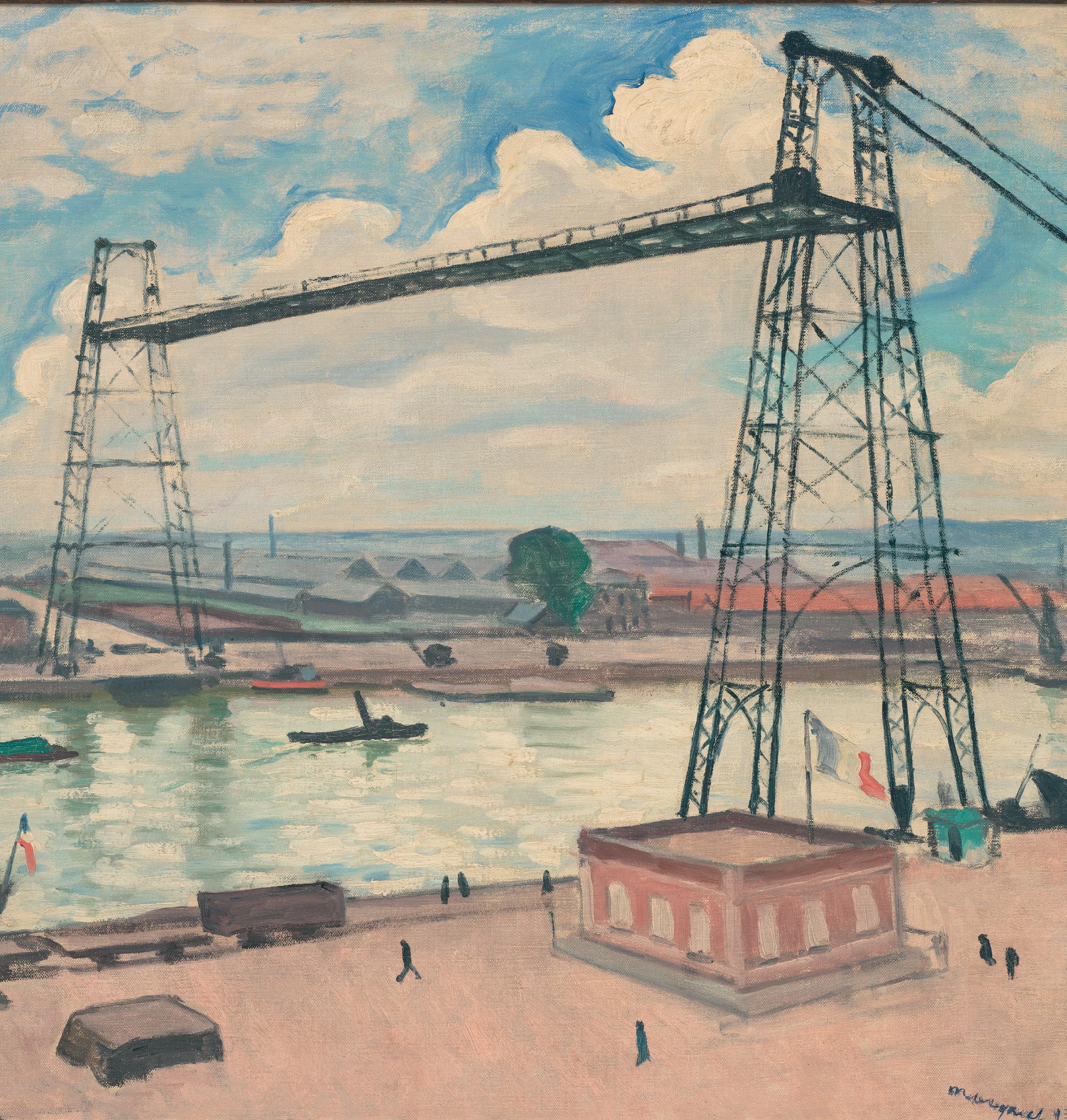 En 1912, il s’arrête à Rouen et peint ce port fluvial qui ressemble à tant d’autres. Il ne choisit que deux vues : le quai et le pont de Boiledieu avec au fond la ville de Rouen hérissée de cheminées avec ses trainées de fumeroles reprenant en l’adaptant les quais de Seine de Paris, et le pont transbordeur qui enjambait la Seine. Ce dernier donne un avant-goût de celui si célèbre de Marseille qu’il découvre probablement lors de son premier séjour sur les bords de la méditerranée en 1905 et qu’il peint pendant la guerre de 1914.
