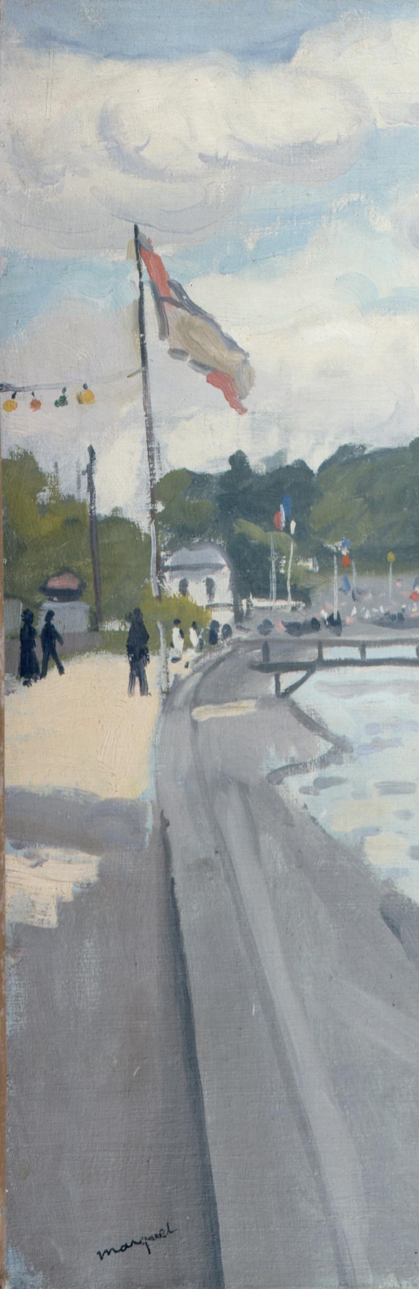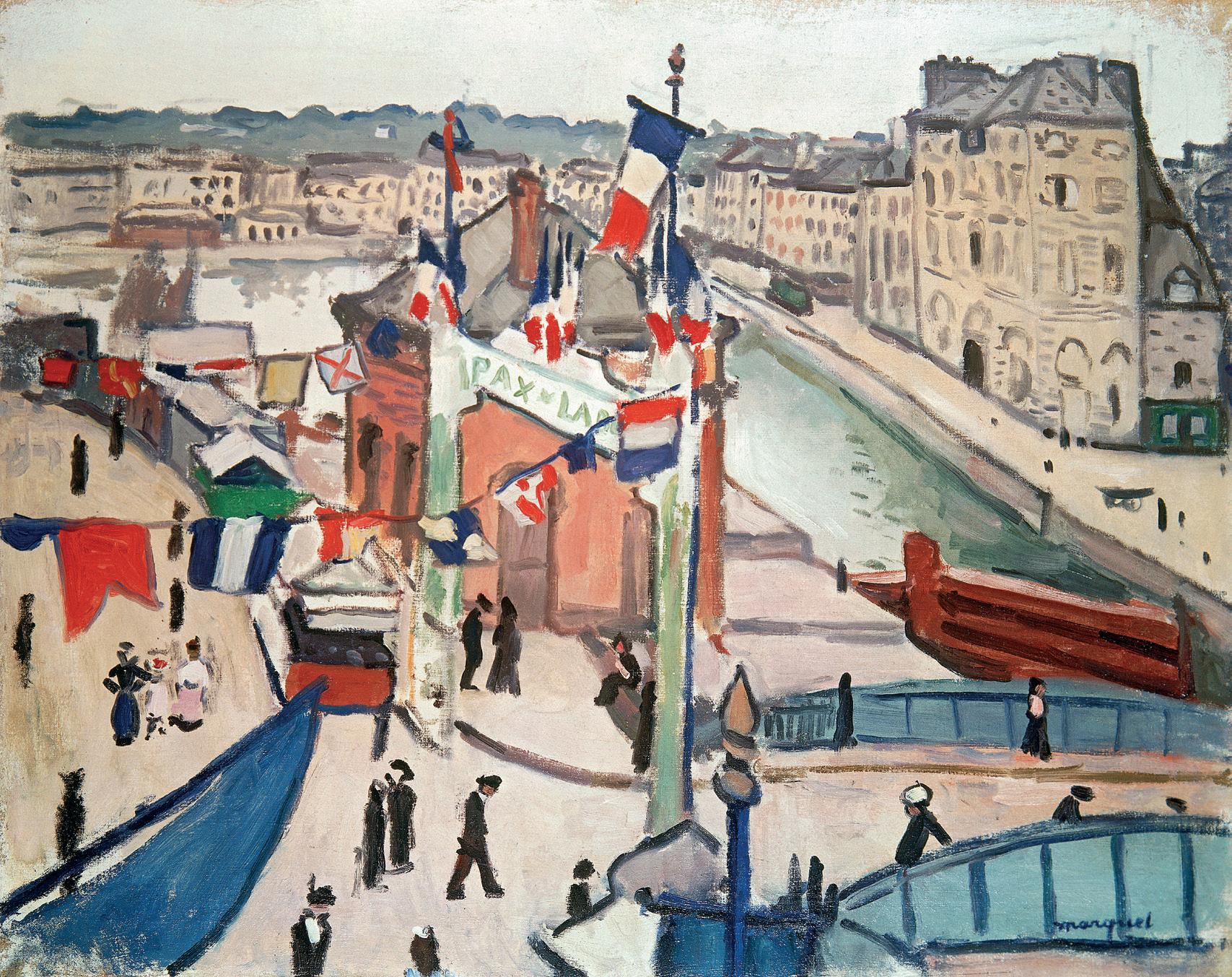 sur la tête, viennent contrarier les rectangles des pavois et des immeubles. Marquet quant à lui, plus respectueux de la réalité, dessine une grande diagonale qui sépare en deux la rue : d’un côté, les façades sombres, à l’ombre, rehaussées des drapeaux bleu blanc rouge et de lampions rouges, de l’autre, le ciel bleu lumineux créant par contraste une perspective. Presque au centre, un mât vertical noir portant une bannière bleu blanc rouge vient séparer et réunir les deux espaces grâce à un coin de toile du drapeau laissant voir un coin le ciel par transparence. Les autres mâts de biais créent un lacis inextricable. Les badauds sont presque toujours ces petits insectes noirs à l’exception de deux femmes portant des robes longues et blanches. « La rue respire la fête » . Marquet n’aime pas être à même le sol, il préfère l’altitude pour voir le spectacle en plongée et à l’abri des regards, ce qu’il fera pour le carnaval de Fécamp où de haut il assiste au défilé des chars qu’on devine à peine. Il peindra plus tard, en 1934, aux Sables d’Olonne, une fête nationale associant la plage et le fourmillement des baigneurs et des tentes bicolores le long du parapet pavoisé. Pour la première fois, les passants sont vus de près, presque identifiables et en couleur accompagnés de leur ombre portée ! Et si la foule n’est pas assez nombreuse, il ajoute des balconnières de géranium rouges !