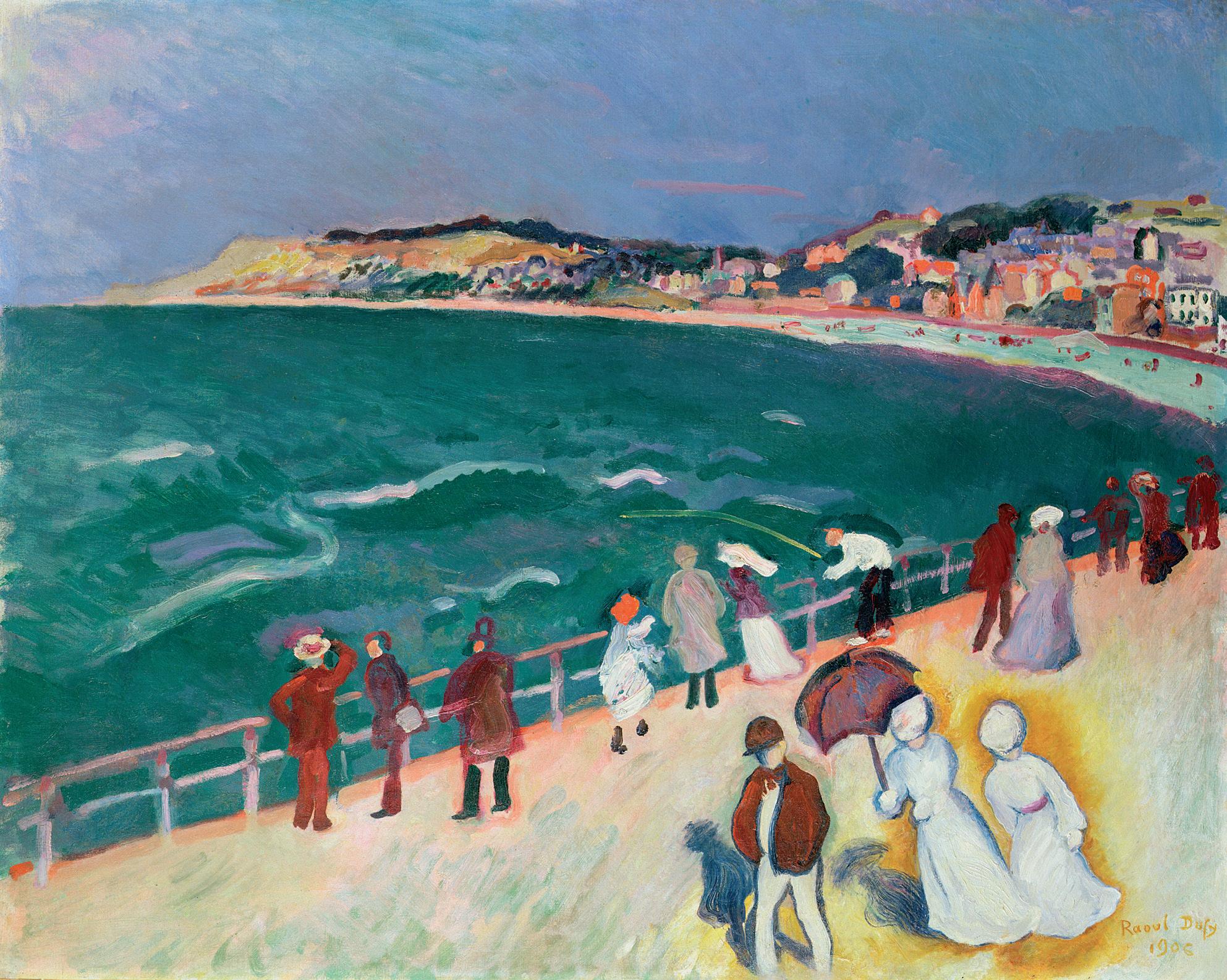 Côte, plage, estacade, promenade, tentes rayées gonflées par le vent … avec Dufy, il explore ce caléidoscope coloré qu’est la plage. Dufy aime les baignades, les pêcheurs et les régates ainsi que la promenade qui épouse la courbe de la plage tandis que Marquet préfère les badauds, les promeneurs qu’il sait silhouetter à merveille.