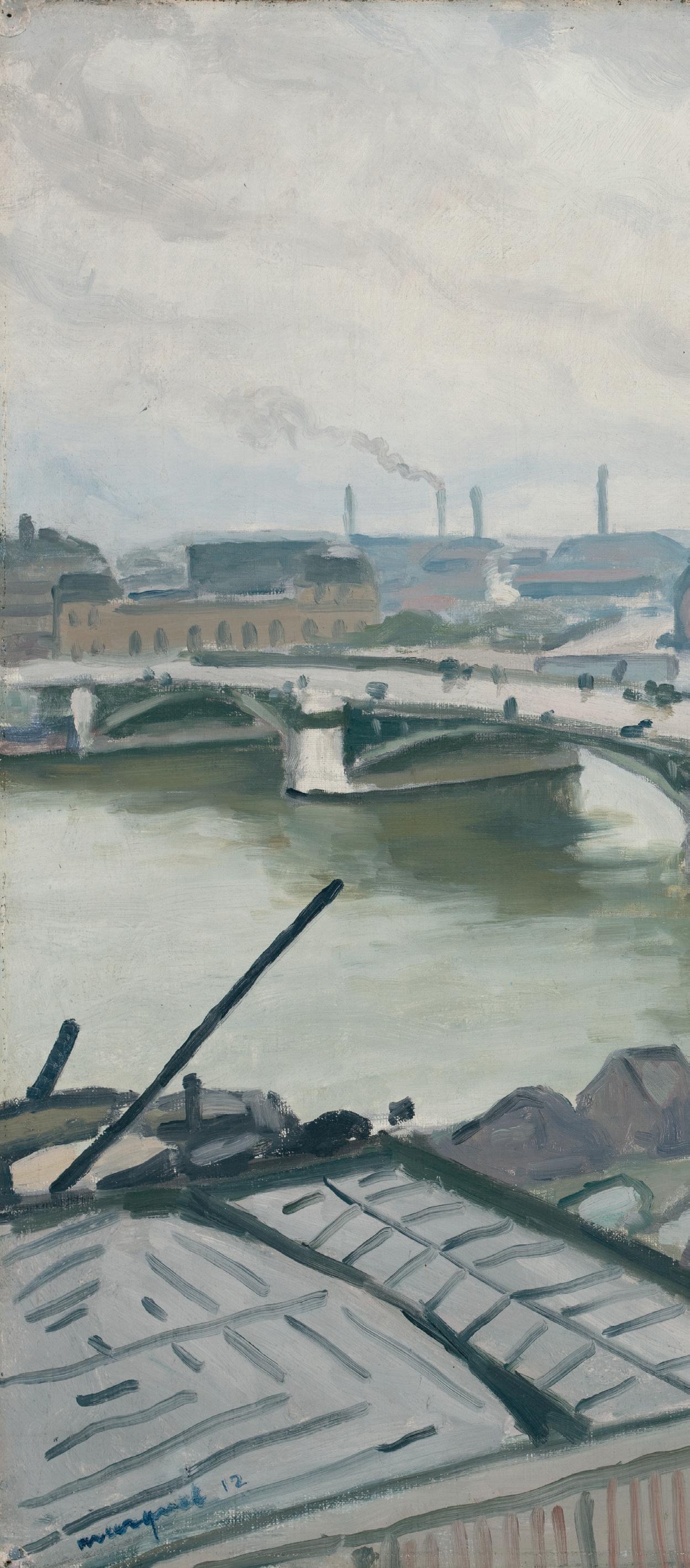 En 1912, Marquet séjourne à Rouen et s’installe dans l’hôtel où Pissarro lui-même avait pris ses quartiers lors de son deuxième séjour dans le port normand, au début de l’année 1896. Des fenêtres de leur chambre du Grand Hôtel de Paris, sur le quai éponyme, rive droite, les deux peintres peuvent embrasser la vue bordée par les ponts Boieldieu et Corneille, les quais et la Seine, débordant d’activité.